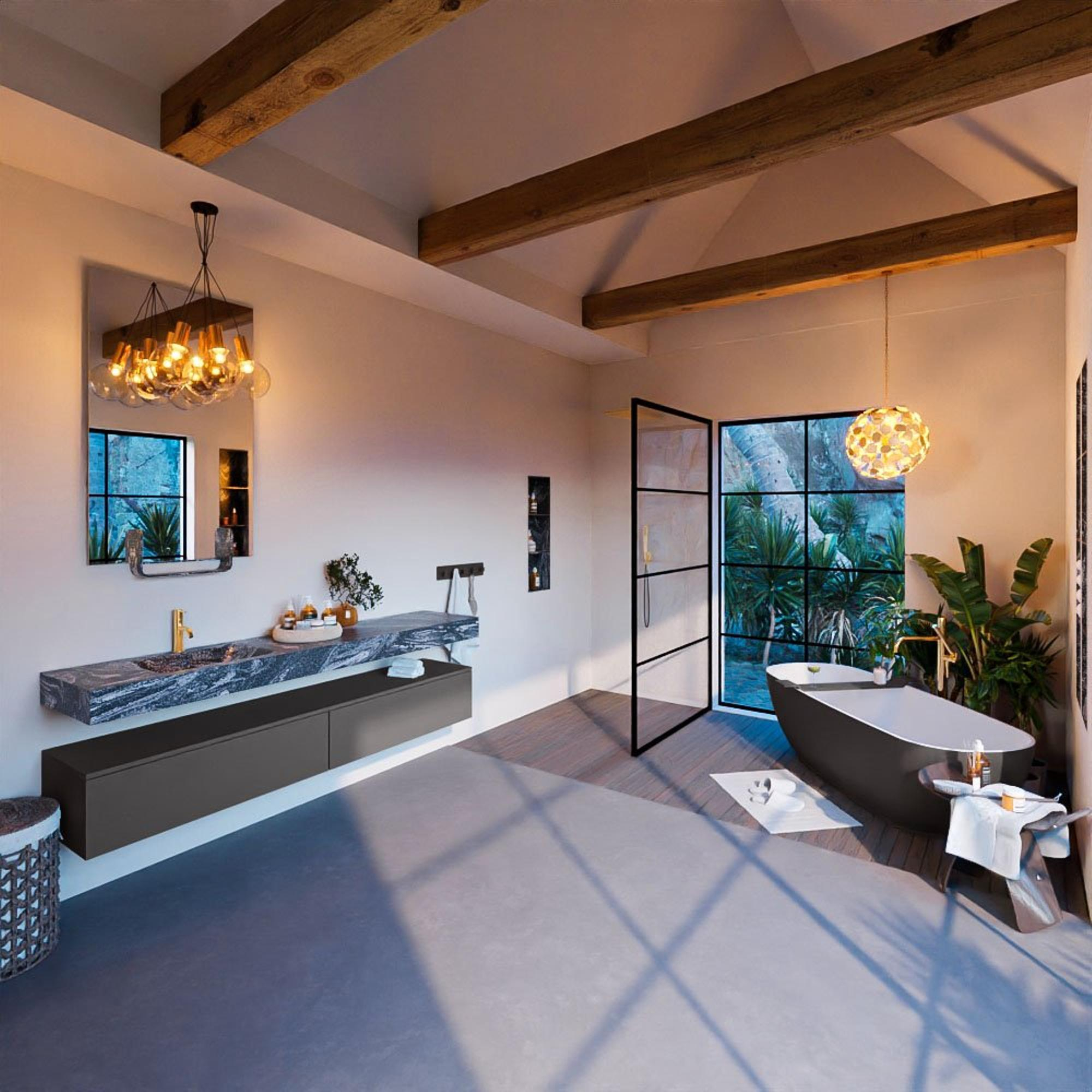 De MONDIAZ ALAN - DLUX Badkamermeubelset is ontworpen met een moderne esthetiek in gedachten. De strakke lijnen, donkergrijze kleur en vrijhangende wastafel creëren een eigentijdse uitstraling die perfect past bij een eigentijdse badkamer. De subtiele details, zoals de lava-afwerking en de positionering van de wasbak aan de linkerkant, voegen een vleugje luxe toe aan de ruimte.