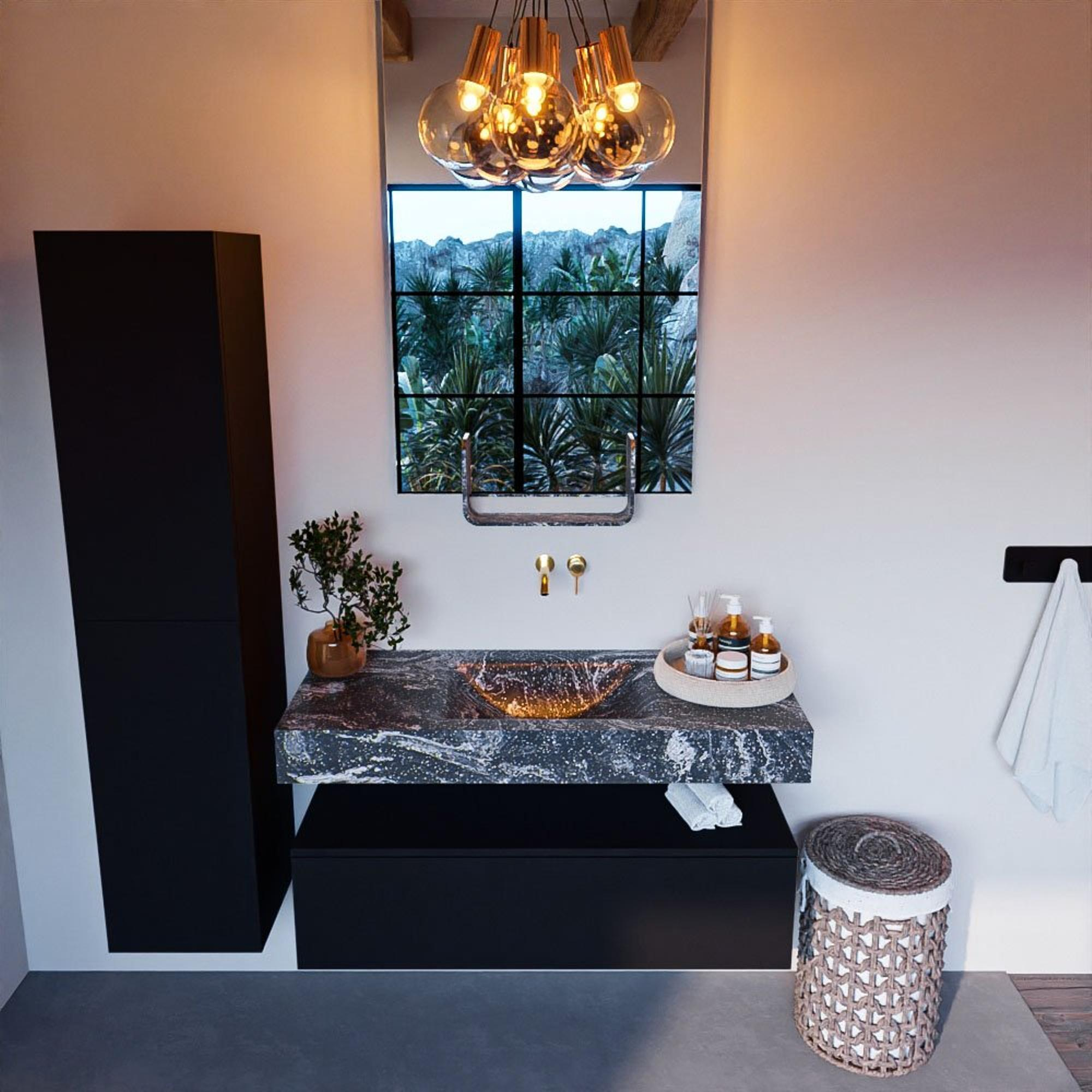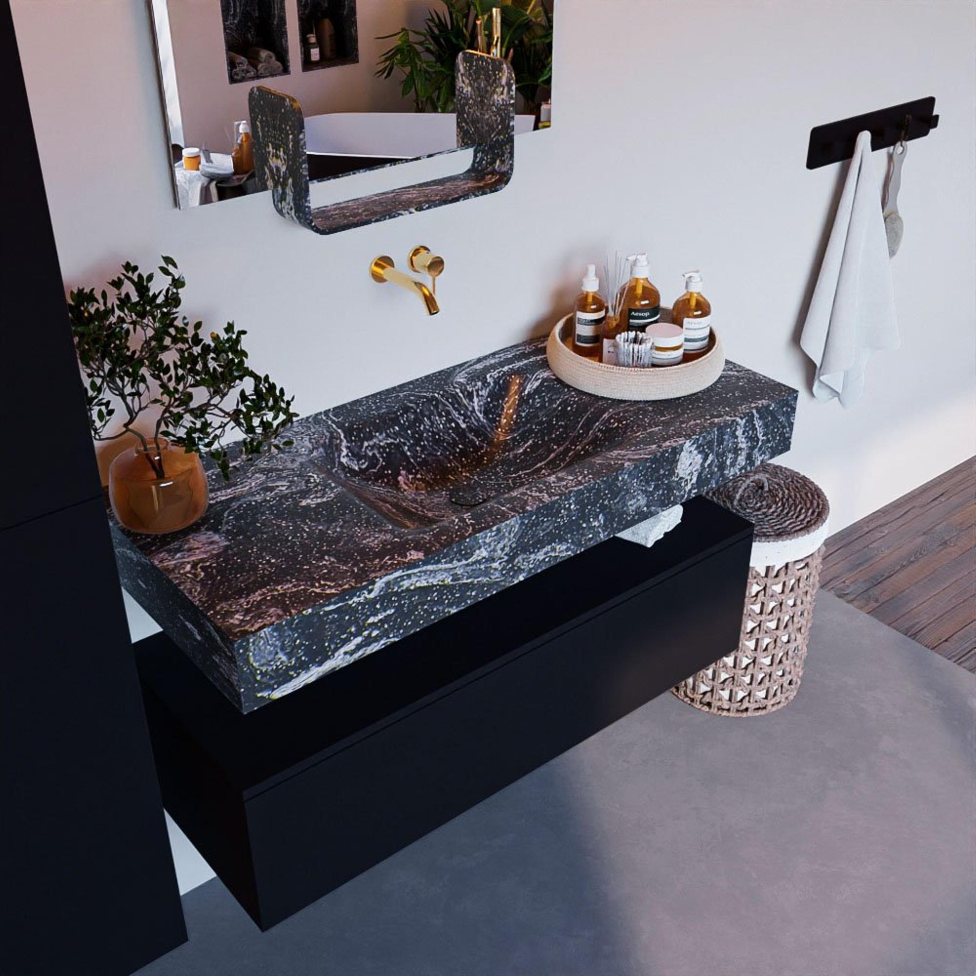 De MONDIAZ ALAN - DLUX Badkamermeubelset straalt stijl en elegantie uit. Het Urban design past perfect in moderne badkamers en creëert een trendy sfeer. De vrijhangende wastafel met de wasbak in het midden geeft een gevoel van ruimte en minimalisme. De Lava kleur voegt een vleugje warmte toe aan de omgeving, waardoor je badkamer een uitnodigende plek wordt om te ontspannen en tot rust te komen.