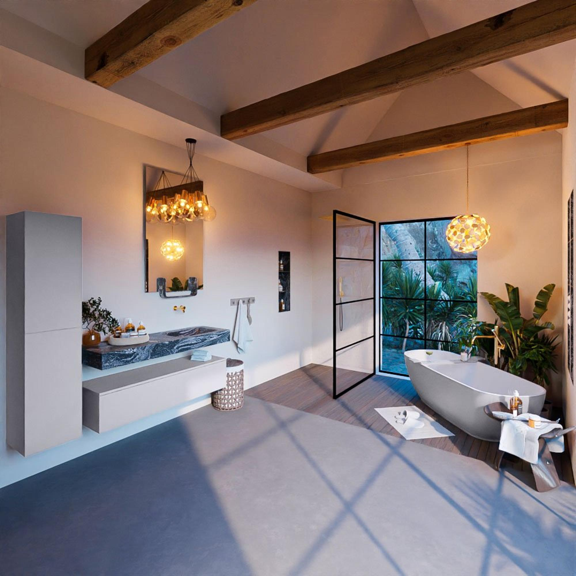 Met zijn strakke lijnen en eigentijdse ontwerp straalt het MONDIAZ ALAN - DLUX Badkamermeubelset stijl en elegantie uit. De onderkast en vrijhangende wastafel creëren een moderne en luxe uitstraling die perfect past bij elke moderne badkamerinrichting. De subtiele Lava kleur voegt een vleugje verfijning toe aan de ruimte, waardoor dit meubelstuk een echte blikvanger wordt.