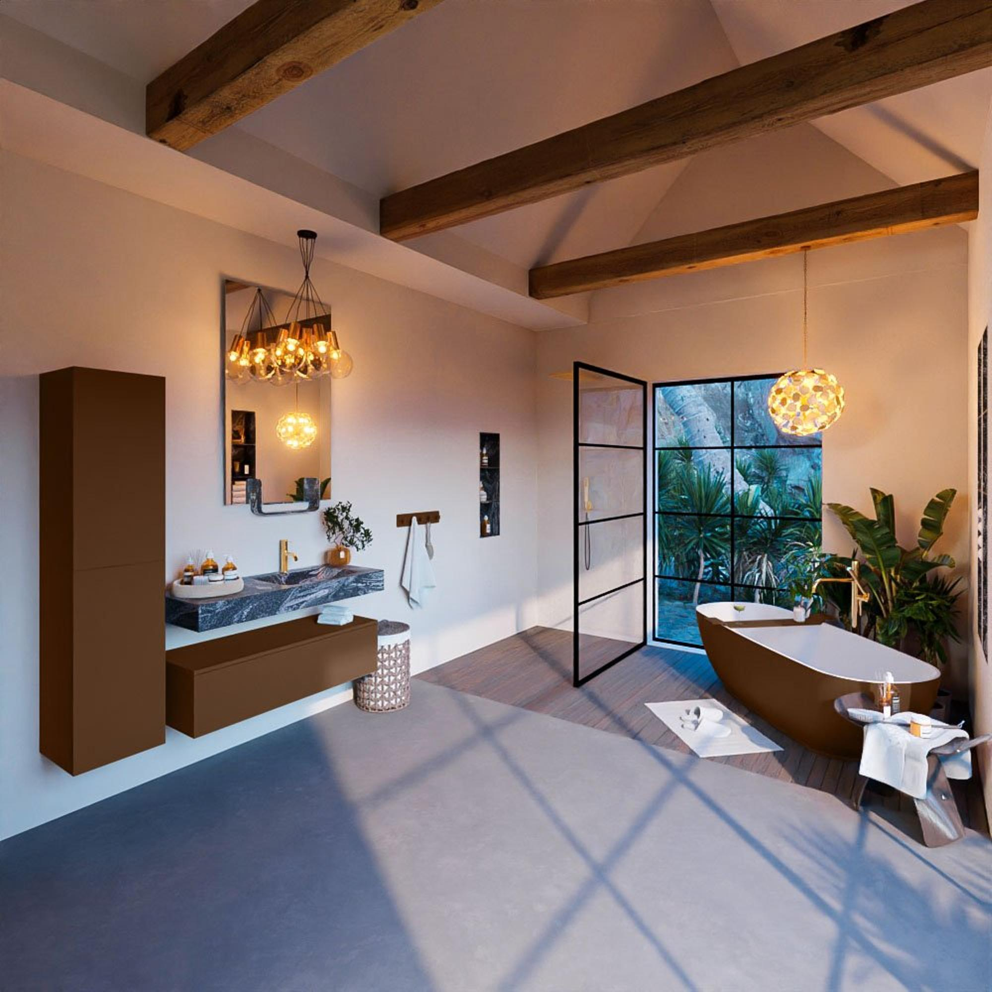 De MONDIAZ ALAN - DLUX Badkamermeubelset straalt stijl en klasse uit met zijn elegante ontwerp en subtiele details. De Rust kleur geeft een warme en uitnodigende uitstraling, terwijl de vrijhangende wastafel zorgt voor een luchtige en moderne look in je badkamer. De perfecte combinatie van functionaliteit en design.