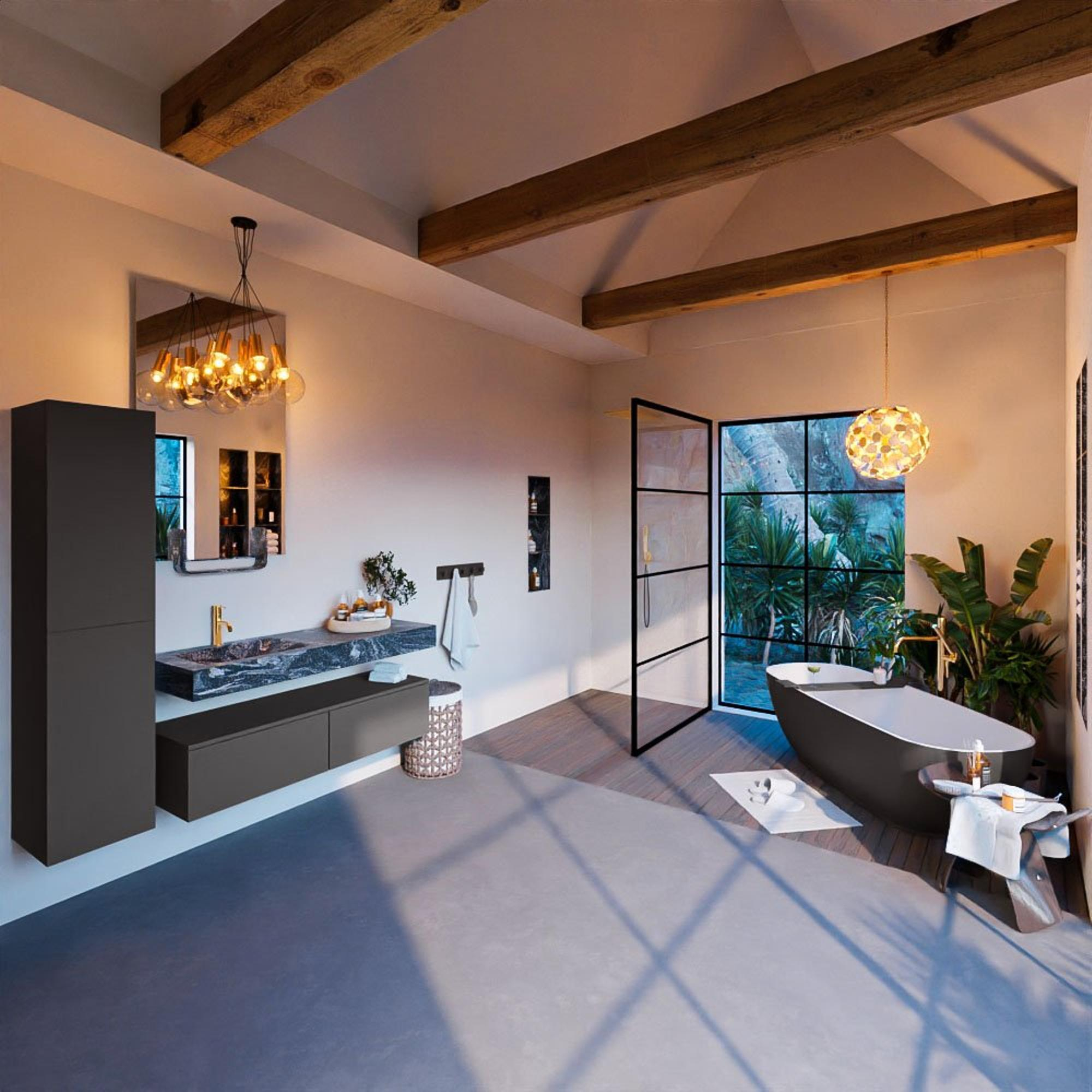 De MONDIAZ ALAN - DLUX Badkamermeubelset is een perfecte keuze voor wie op zoek is naar een modern tintje in de badkamer. De lava-afwerking geeft het meubel een eigentijdse uitstraling die perfect past bij een minimalistische inrichting. Het strakke design en de hoogwaardige materialen maken dit meubel een blikvanger in elke badkamer.
