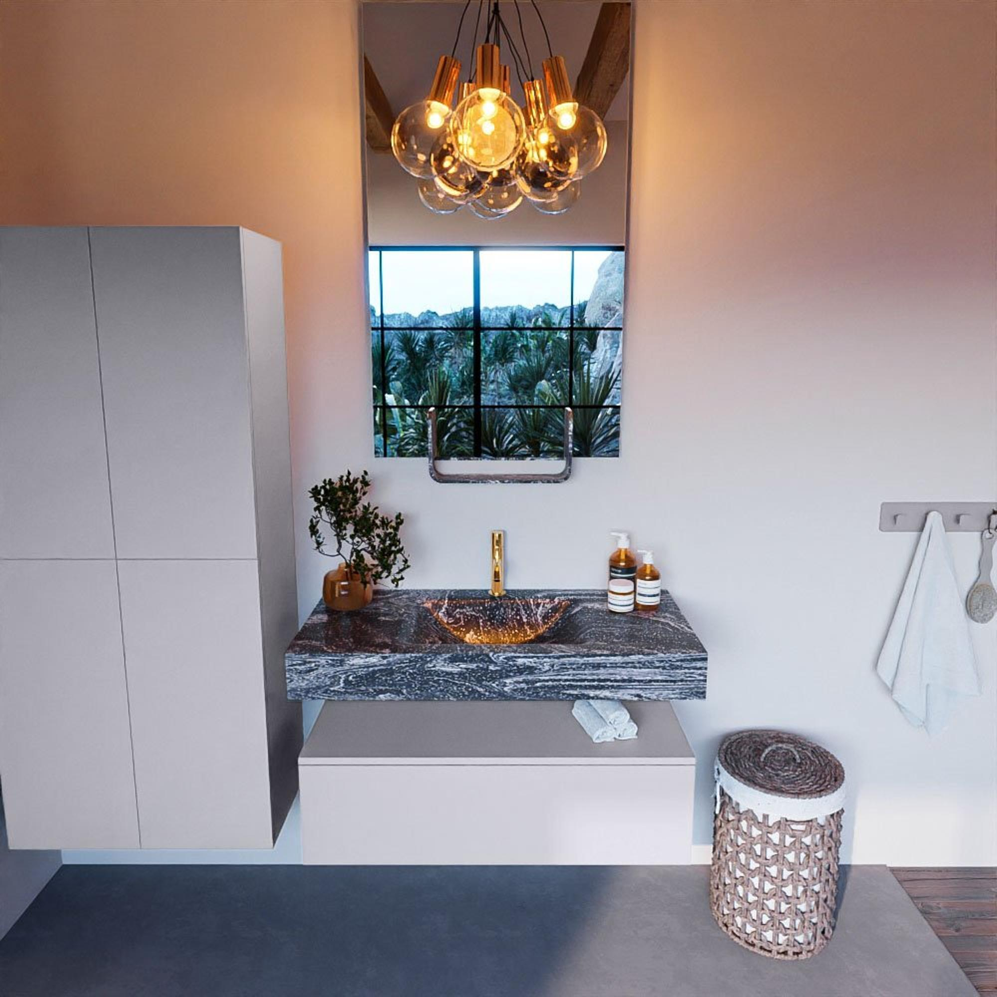De MONDIAZ ALAN - DLUX badkamermeubelset straalt stijl en klasse uit. Het ontwerp met de vrijhangende wastafel en de subtiele Lava afwerking zorgen voor een eigentijdse uitstraling. De strakke lijnen en de perfecte balans tussen functionaliteit en design maken dit meubelstuk een blikvanger in elke badkamer.