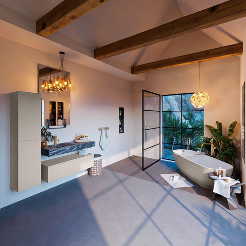 De MONDIAZ ALAN - DLUX badkamermeubelset straalt een tijdloze elegantie uit die moeiteloos past bij verschillende badkamerstijlen. Het Linen design en de vrijhangende wastafel creëren een gevoel van ruimte en lichtheid, terwijl de subtiele details zoals de kraangat en Lava afwerking een vleugje luxe toevoegen aan de omgeving.