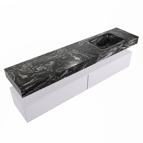 Dit badkamermeubelset onderscheidt zich door zijn stijlvolle ontwerp en hoogwaardige afwerking. De combinatie van de onderkast met 2 ruime lades en de vrijhangende wastafel creëert een eigentijdse uitstraling die perfect past bij moderne badkamers. De wasbak aan de rechterkant zorgt voor een doordachte indeling en maakt efficiënt gebruik van de beschikbare ruimte.