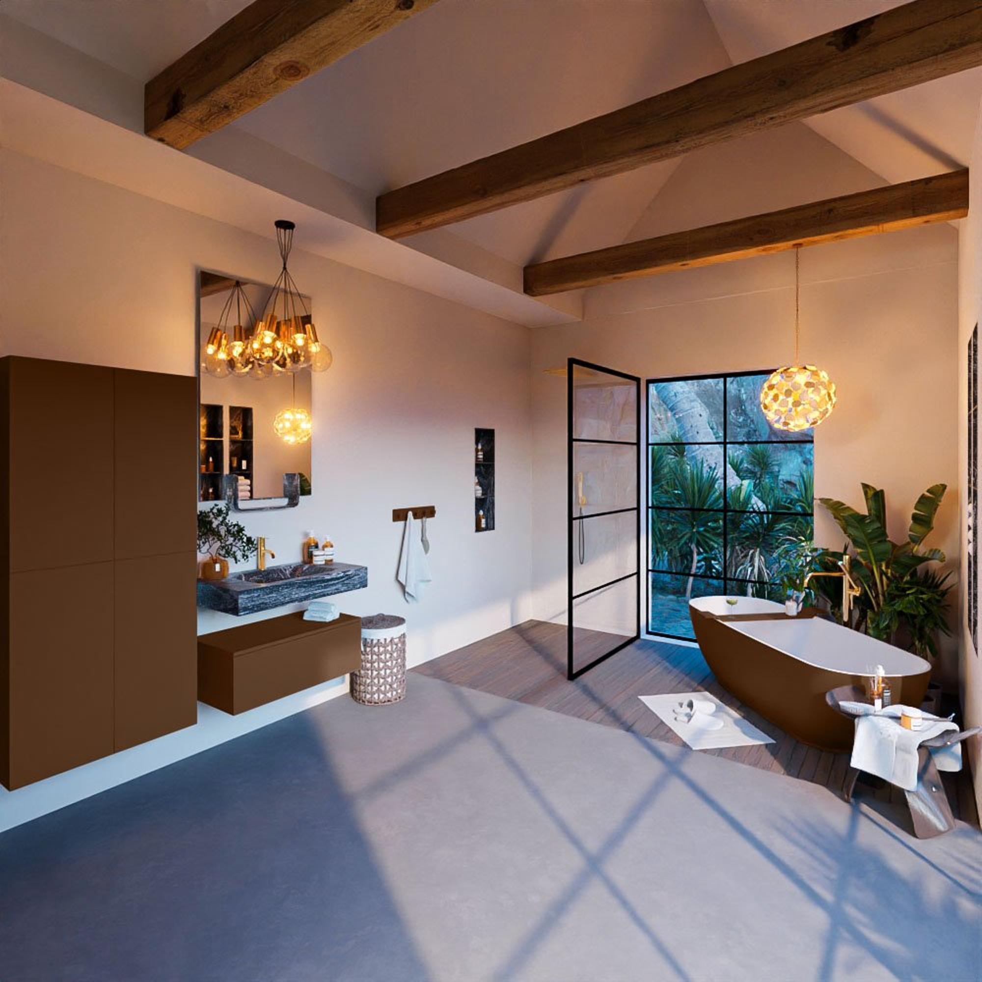 De MONDIAZ ALAN - DLUX badkamermeubelset straalt stijl en klasse uit. Het rustieke ontwerp in combinatie met de lava-afwerking geeft een warme en luxe uitstraling aan de badkamer. De vrijhangende wastafel en de wasbak in het midden zorgen voor een eigentijdse look, terwijl de 1 lade voldoende ruimte biedt om badkamerbenodigdheden netjes op te bergen.