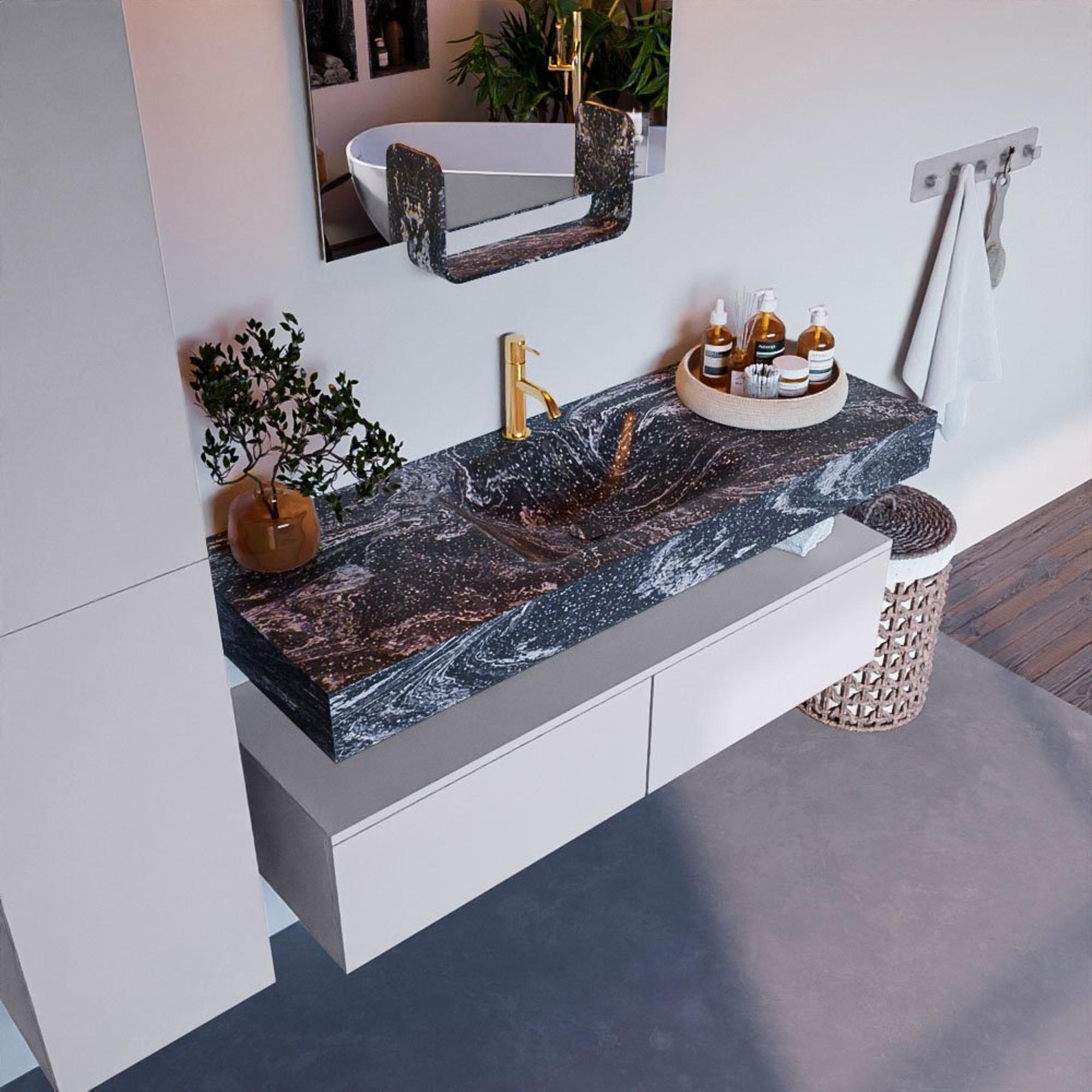 De MONDIAZ ALAN - DLUX Badkamermeubelset straalt stijl en elegantie uit. Het ontwerp met de vrijhangende wastafel en de wasbak in het midden zorgt voor een eigentijdse uitstraling. De Lava afwerking voegt een vleugje luxe toe aan de badkamer, terwijl de 2 lades voldoende opbergruimte bieden voor al jouw badkamerbenodigdheden. Dit meubelset is perfect voor diegenen die op zoek zijn naar een combinatie van functionaliteit en design.