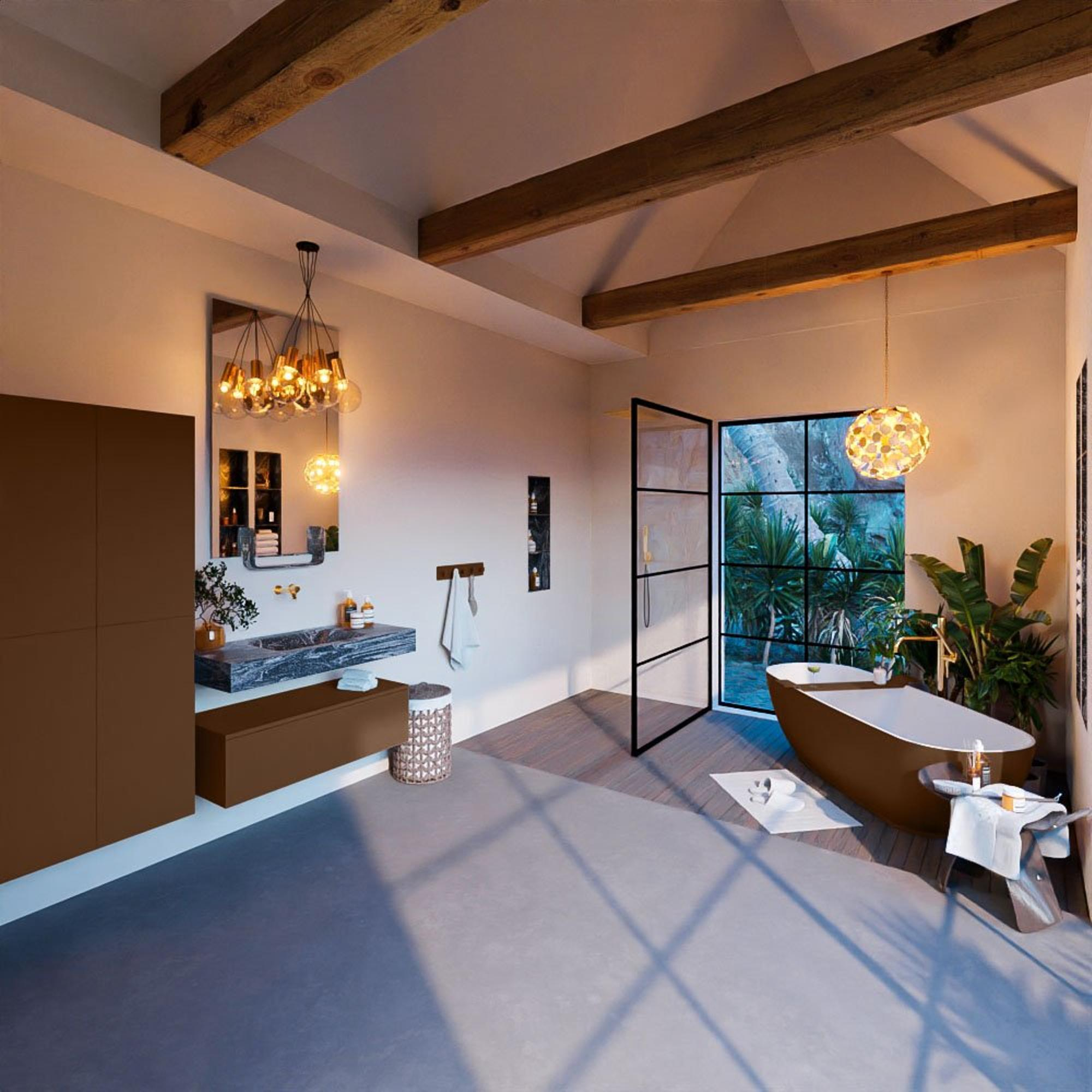 De MONDIAZ ALAN - DLUX Badkamermeubelset straalt een onmiskenbare stijl en elegantie uit die elke badkamer transformeert tot een luxe oase. De combinatie van de rustieke afwerking en het moderne design creëert een unieke uitstraling die de aandacht trekt. Dit badkamermeubelset is niet alleen een functioneel element, maar ook een decoratief pronkstuk dat de sfeer in de badkamer verhoogt.