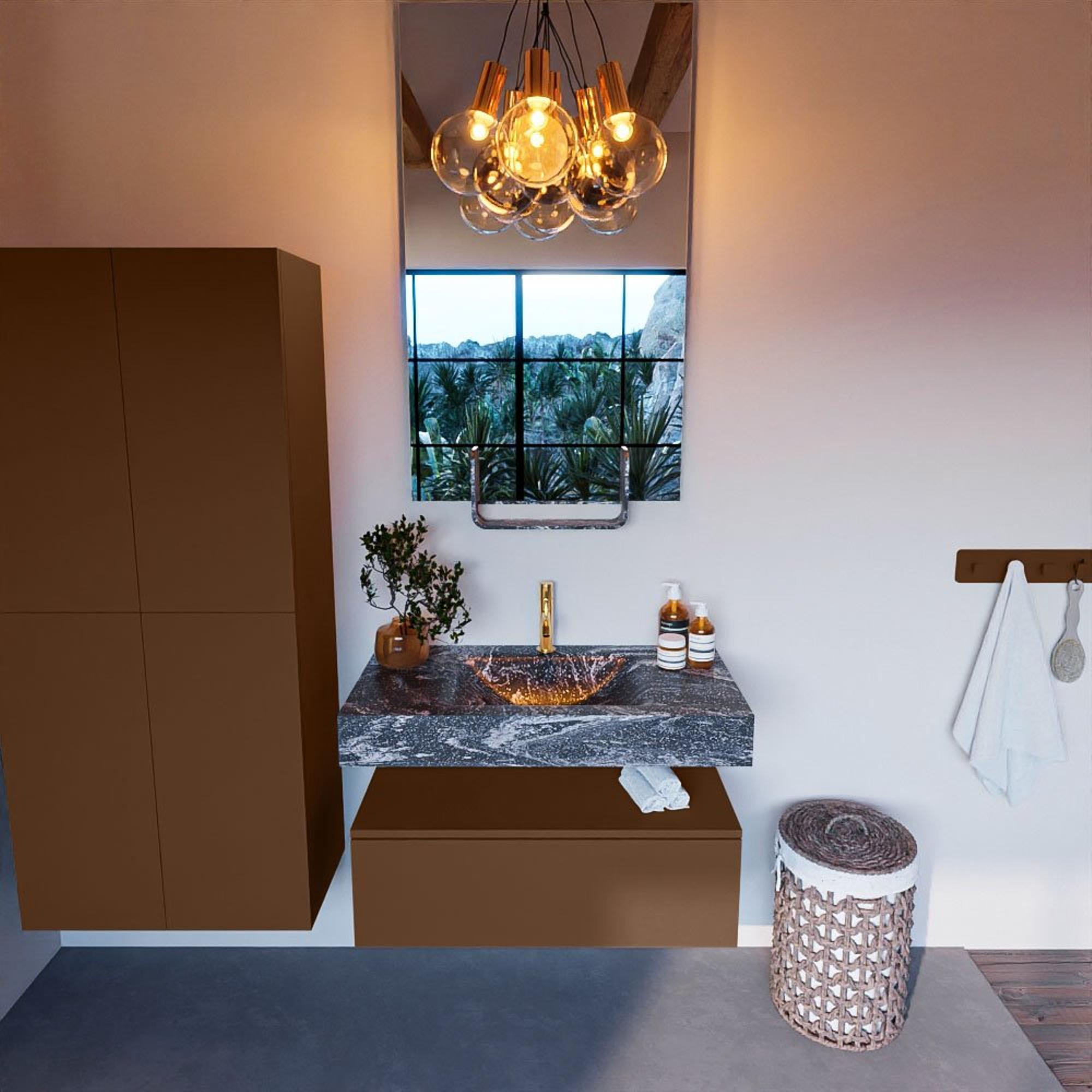 Ervaar de luxe en comfort van de MONDIAZ ALAN - DLUX Badkamermeubelset. De hoogwaardige materialen en afwerking zorgen voor een duurzaam en luxueus gevoel. De lava-kleurige afwerking geeft een warme en uitnodigende uitstraling aan de badkamer. Met de vrijhangende wastafel en het kraangat in het midden, straalt deze set een gevoel van luxe en verfijning uit, waardoor je badkamer een echte spa-achtige sfeer krijgt.