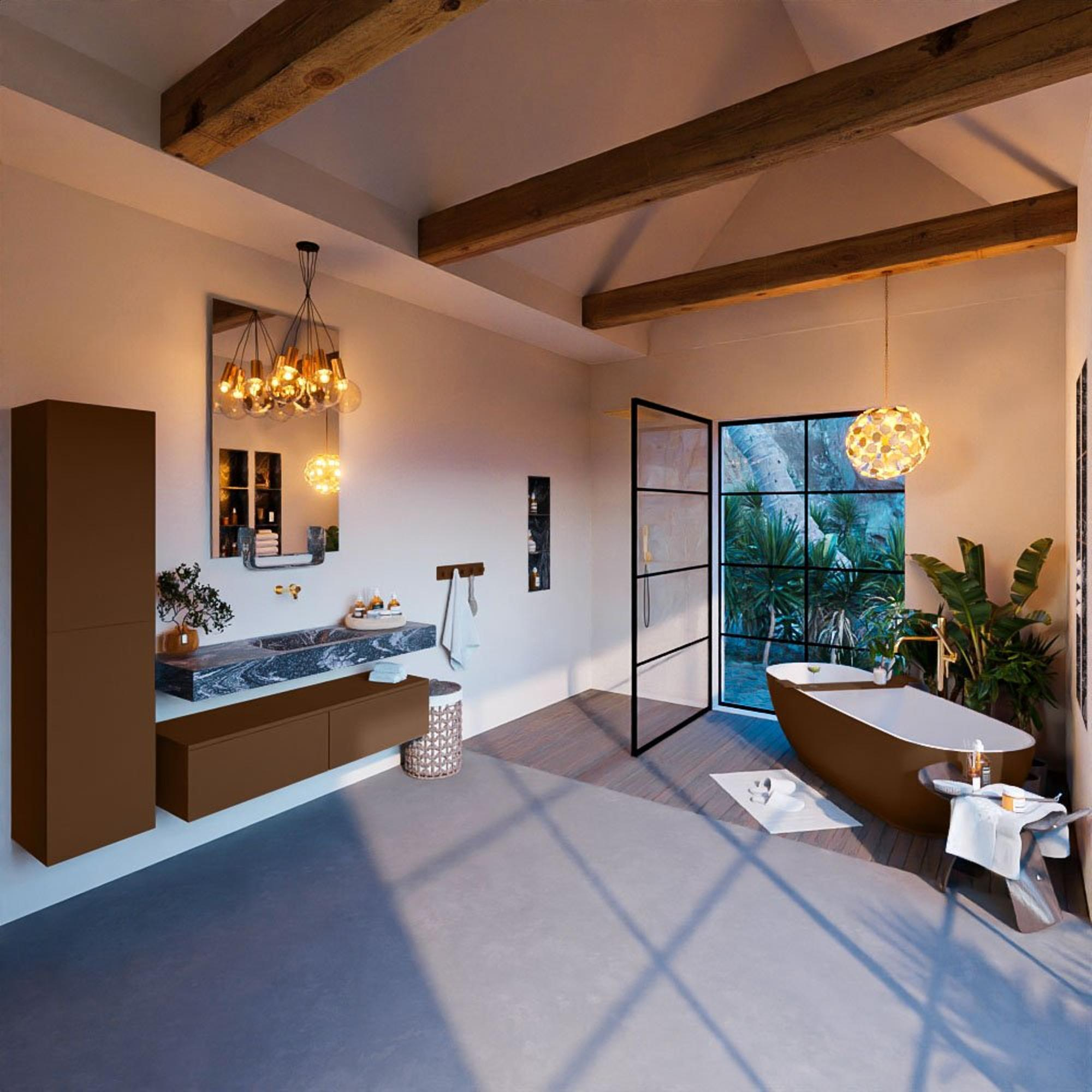 De MONDIAZ ALAN - DLUX badkamermeubelset straalt een tijdloze elegantie uit. De rustieke afwerking in de kleur Lava zorgt voor een warme en gezellige sfeer in je badkamer. De vrijhangende wastafel met de wasbak in het midden geeft een moderne touch aan het geheel. De strakke lijnen en het slimme ontwerp maken dit meubelstuk perfect voor zowel kleine als grote badkamers.