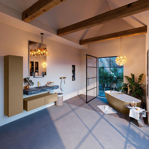 De MONDIAZ ALAN - DLUX Badkamermeubelset straalt stijl en elegantie uit. De Oro kleur geeft een warme en luxe uitstraling aan de badkamer. De vrijhangende wastafel en de middengeplaatste wasbak creëren een eigentijdse look die perfect past bij moderne interieurs. Dit badkamermeubel is niet alleen functioneel, maar ook een ware eyecatcher in de ruimte.
