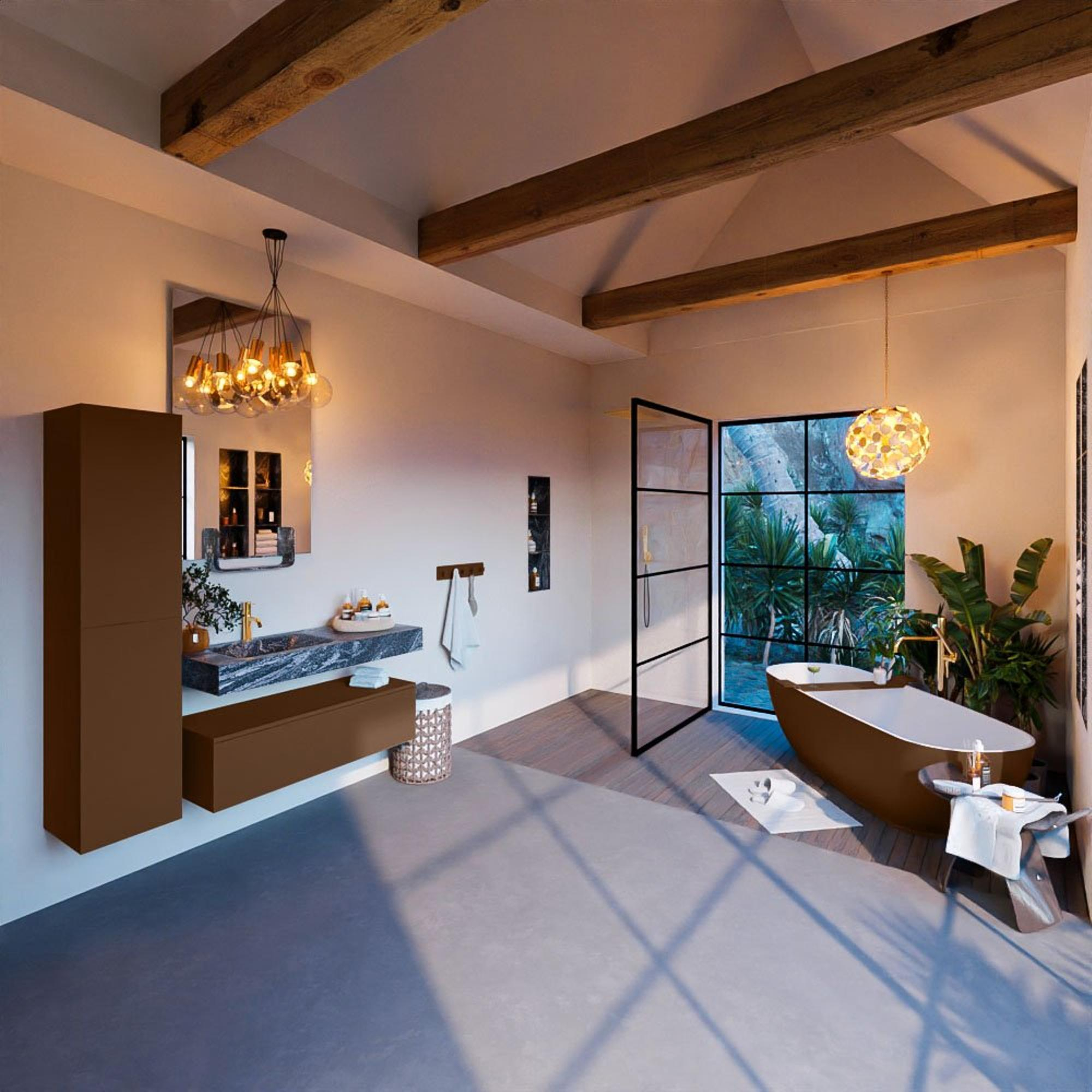 De MONDIAZ ALAN - DLUX Badkamermeubelset straalt moderniteit uit in elke vezel. De strakke lijnen en het eigentijdse ontwerp passen perfect in hedendaagse badkamers. De vrijhangende wastafel en de unieke kleur Lava voegen een vleugje eigentijdse elegantie toe aan de ruimte, waardoor een trendy sfeer ontstaat die niet onopgemerkt zal blijven.