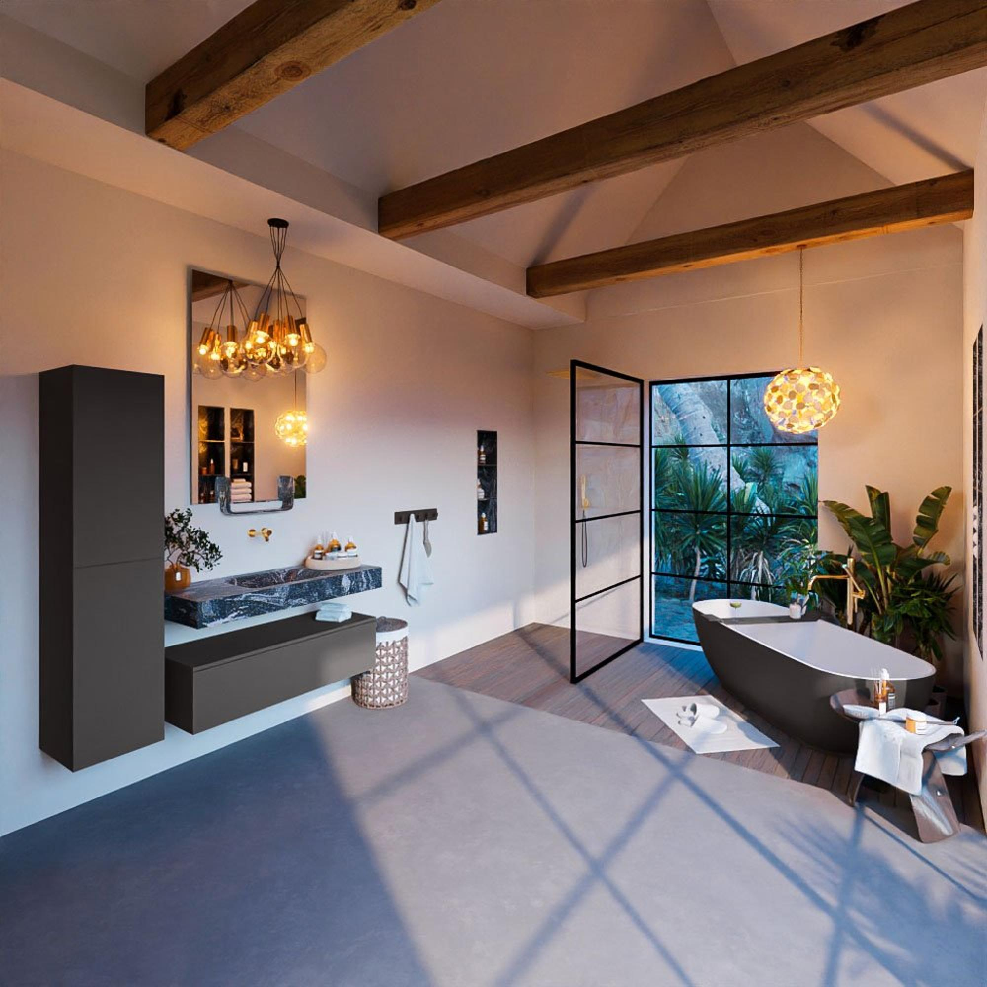 De MONDIAZ ALAN - DLUX badkamermeubelset straalt elegantie en stijl uit. Het donkergrijze ontwerp past perfect bij moderne en klassieke badkamers. De vrijhangende wastafel en de wasbak in het midden creëren een symmetrisch en verfijnd uiterlijk. Deze set is een blikvanger die de badkamer transformeert tot een luxe oase van ontspanning.