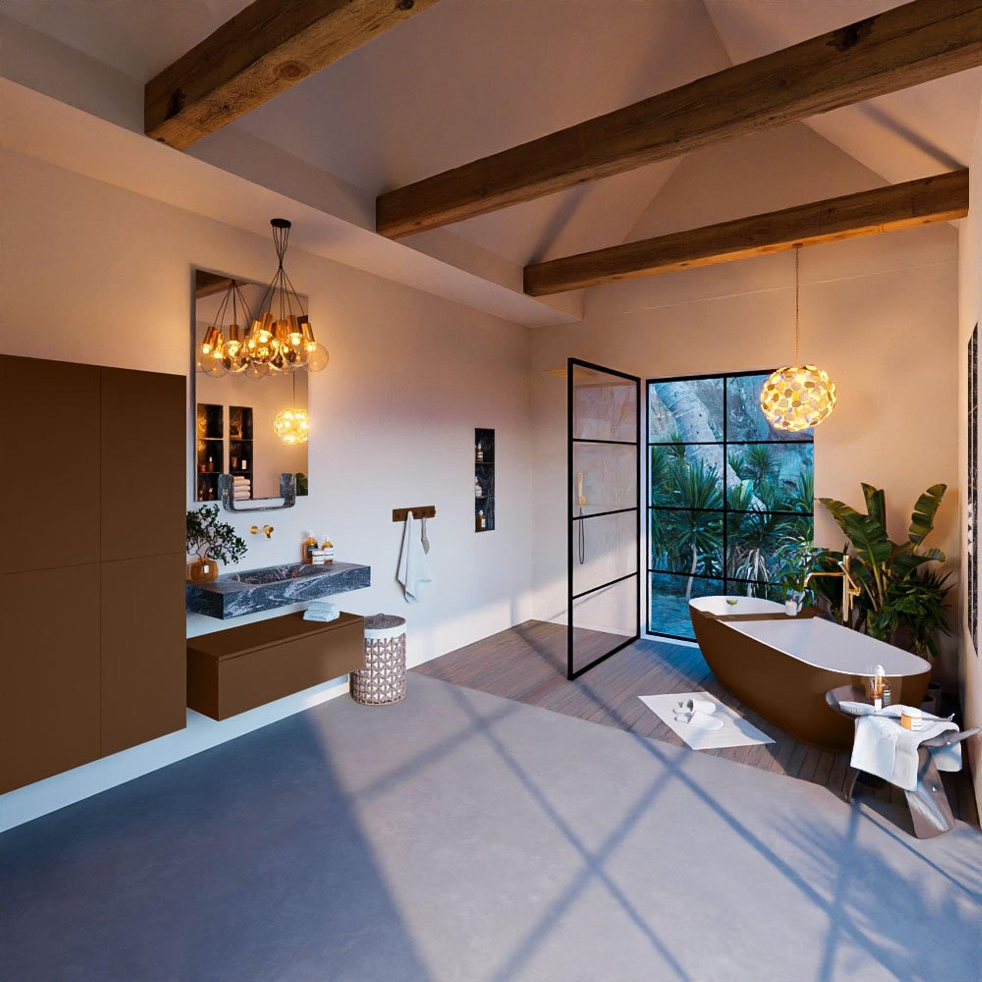 De MONDIAZ ALAN - DLUX Badkamermeubelset straalt stijl en elegantie uit. Met zijn strakke lijnen en rustige Rust kleur past dit meubel perfect in een eigentijdse badkamer. De vrijhangende wastafel en wasbak in het midden creëren een gevoel van ruimte en lichtheid, waardoor de badkamer een luxe uitstraling krijgt.