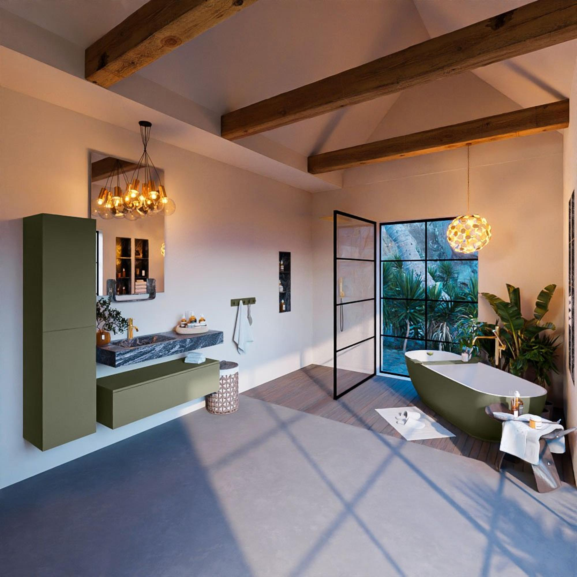 De Lava afwerking van dit badkamermeubelset geeft een gevoel van luxe en elegantie. De diepe, rijke kleur voegt warmte toe aan de badkamer en creëert een uitnodigende sfeer. De combinatie van de Army kleur met de Lava afwerking zorgt voor een harmonieus geheel dat de badkamer een verfijnde uitstraling geeft.