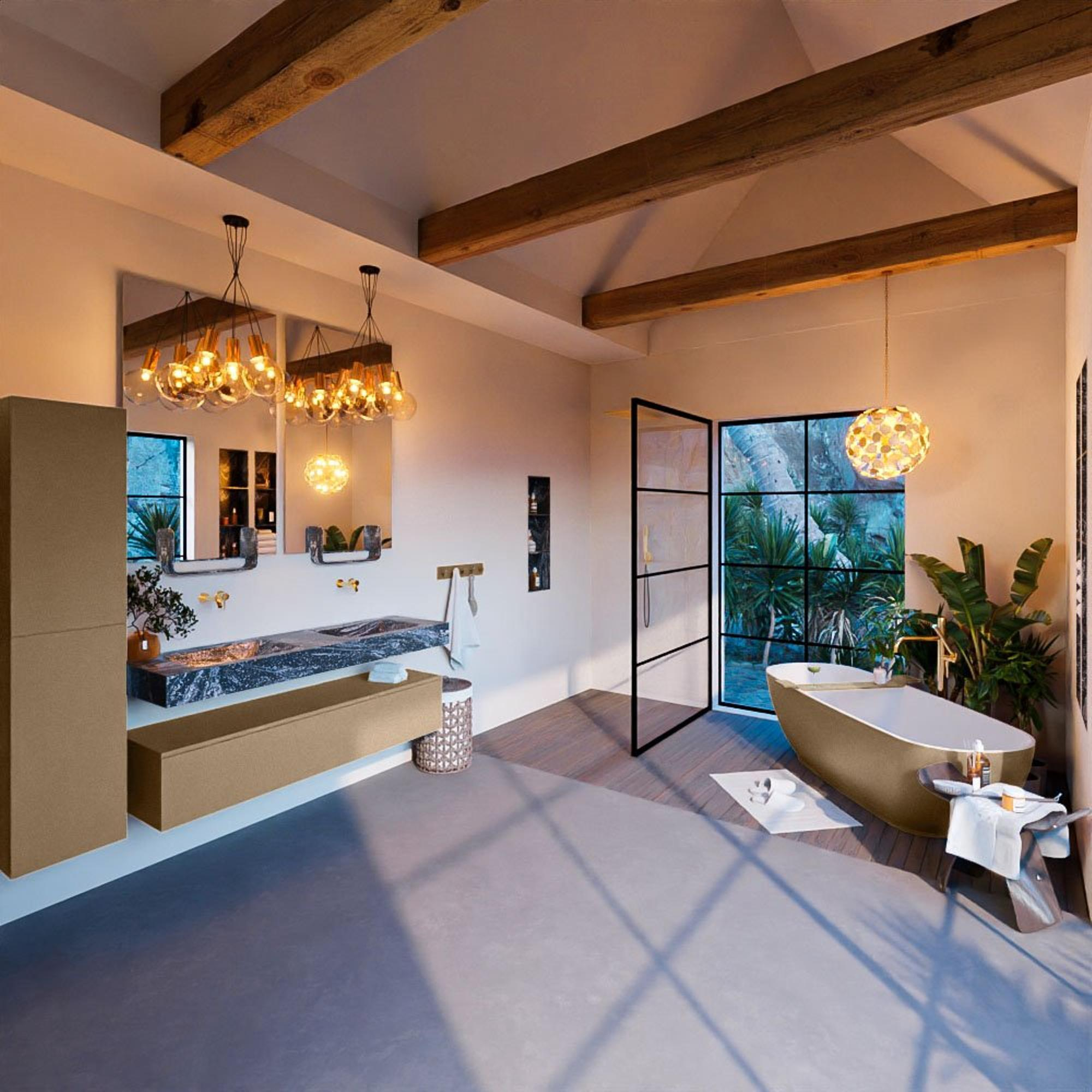 De MONDIAZ ALAN - DLUX Badkamermeubelset is ontworpen met oog voor detail. Het Oro-kleurige onderkastje en de vrijhangende wastafel creëren een stijlvolle en luxe uitstraling. De subtiele afwerking en de strakke lijnen van dit meubelstuk zorgen voor een tijdloos design dat moeiteloos in verschillende badkamerstijlen past.