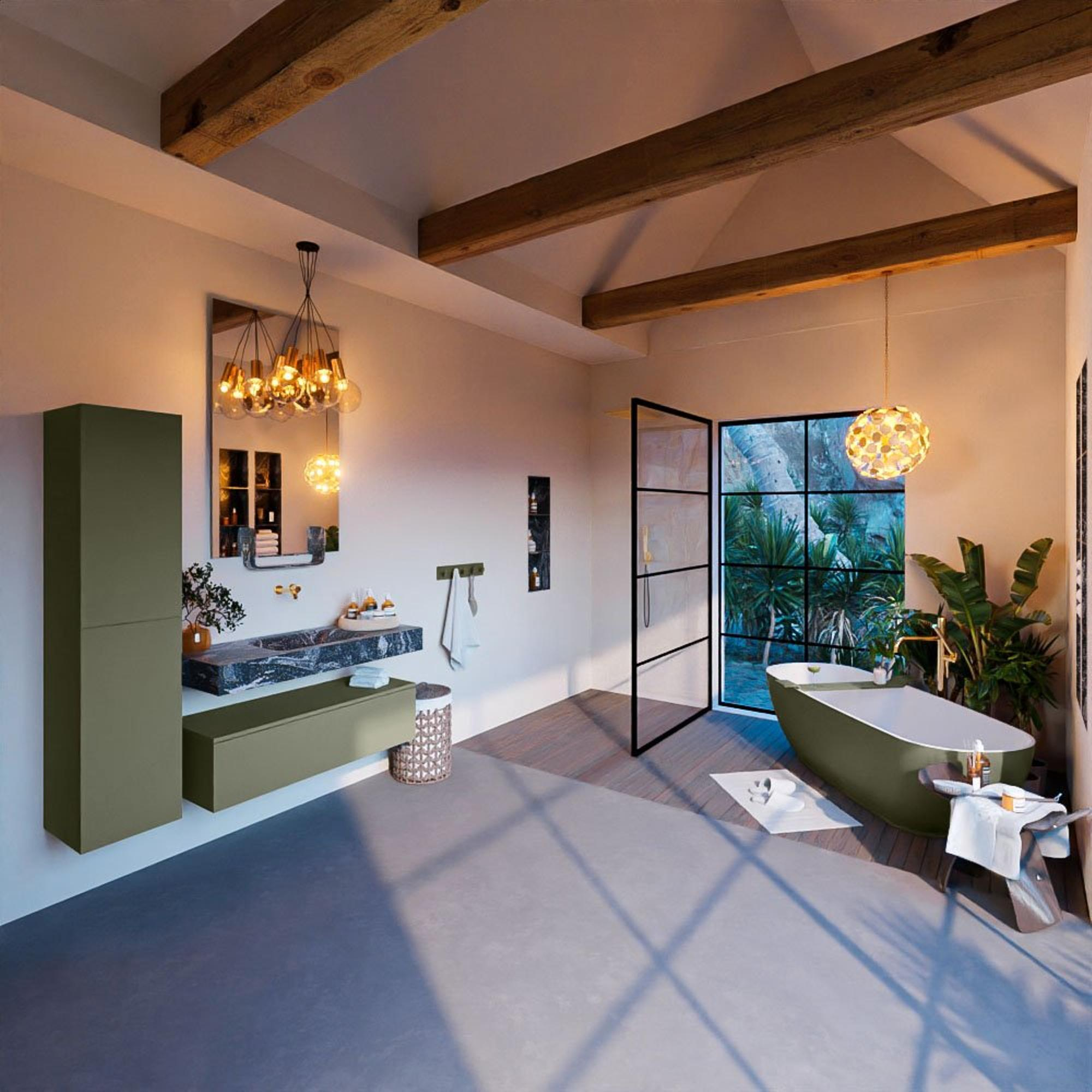 Het MONDIAZ ALAN - DLUX badkamermeubelset straalt stijl en elegantie uit. De combinatie van de Army kleur en de Lava afwerking creëert een luxe uitstraling die de badkamer transformeert tot een oase van rust en schoonheid. Dit meubelset is niet alleen een functioneel element in de badkamer, maar ook een decoratief pronkstuk dat de ruimte verrijkt met zijn verfijnde ontwerp.
