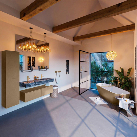 De MONDIAZ ALAN - DLUX badkamermeubelset straalt een tijdloze stijl uit die perfect past bij diverse interieurstijlen. De Oro kleur en de Lava afwerking creëren een harmonieus geheel dat een vleugje elegantie toevoegt aan je badkamer. De vrijhangende wastafel en de strakke lijnen van de onderkast geven een modern en stijlvol accent aan de ruimte.