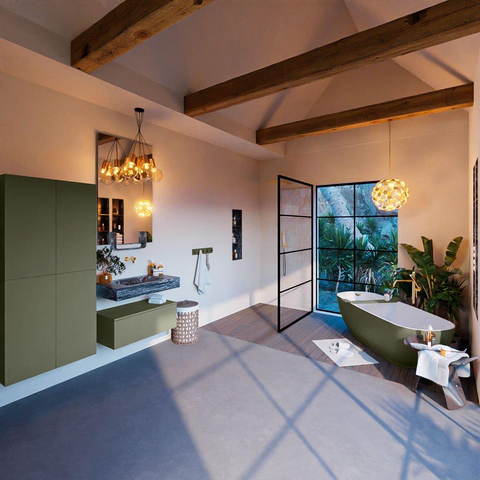 De MONDIAZ ALAN - DLUX badkamermeubelset straalt stijl en elegantie uit. De Army kleur van de onderkast geeft een moderne en chique uitstraling aan de badkamer. De vrijhangende wastafel en de lava wasbak in het midden voegen een vleugje luxe toe aan de ruimte. Dit meubel is perfect voor diegenen die op zoek zijn naar een verfijnde en smaakvolle toevoeging aan hun badkamerinterieur.