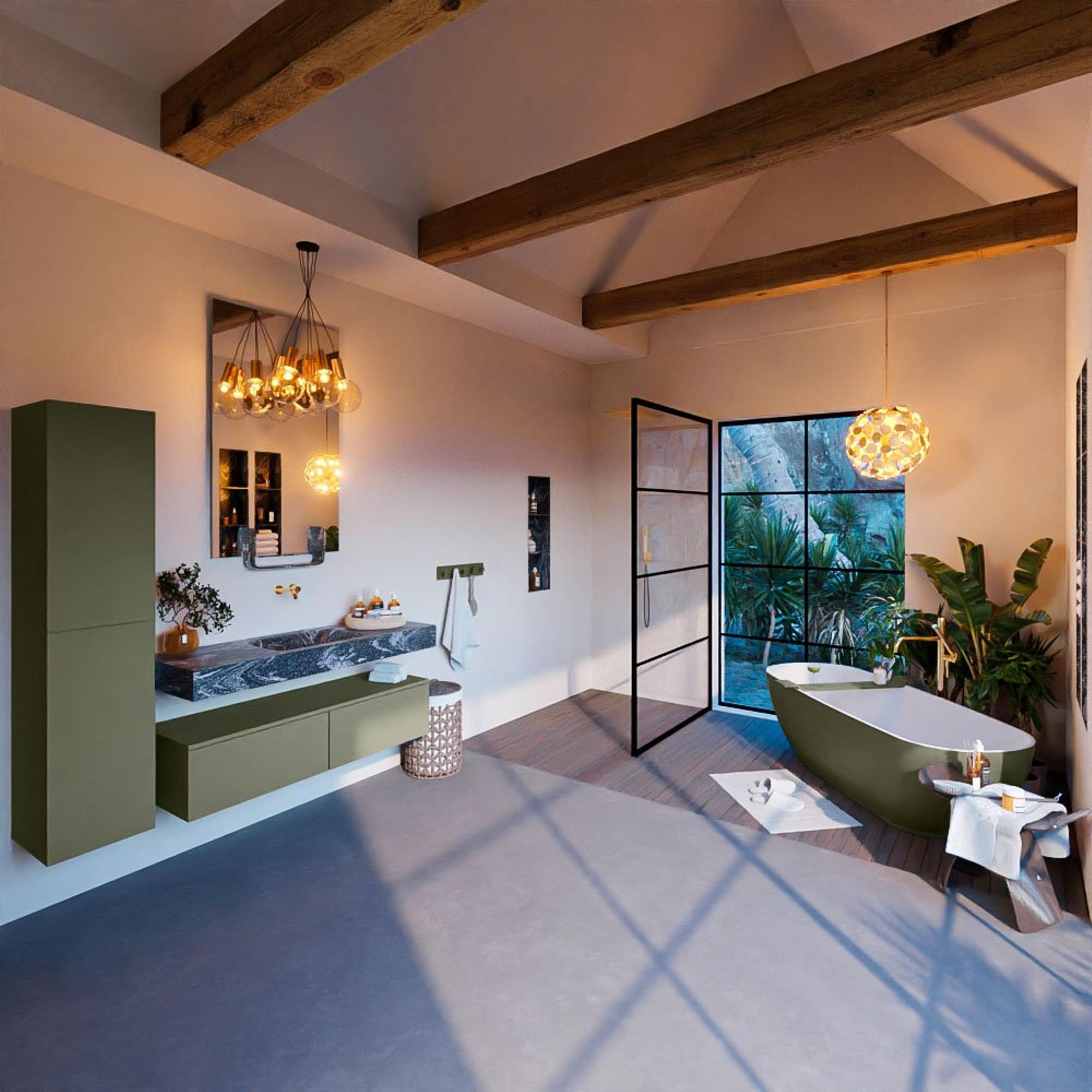 De MONDIAZ ALAN - DLUX Badkamermeubelset straalt stijl en elegantie uit. Het ontwerp is zorgvuldig vormgegeven met oog voor detail. De Army kleur geeft een stoere en eigentijdse uitstraling, terwijl de vrijhangende wastafel een gevoel van ruimte creëert. De combinatie van functionaliteit en esthetiek maakt dit meubelstuk een blikvanger in elke badkamer.