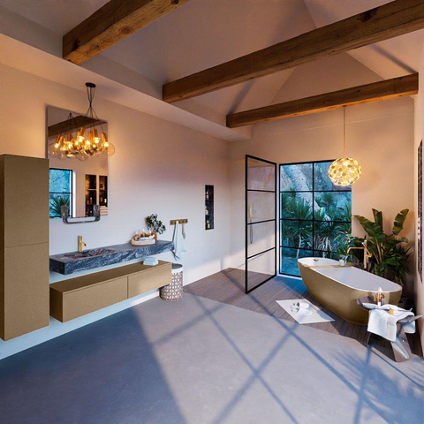 De MONDIAZ ALAN - DLUX Badkamermeubelset straalt stijl uit in elke hoek. De Oro kleur en de Lava afwerking vormen een harmonieus geheel dat een vleugje luxe toevoegt aan je badkamer. De vrijhangende wastafel en de kraangat aan de linkerkant zorgen voor een moderne uitstraling die perfect past bij een eigentijdse badkamerinrichting. Dit badkamermeubel is een statement van klasse en elegantie.