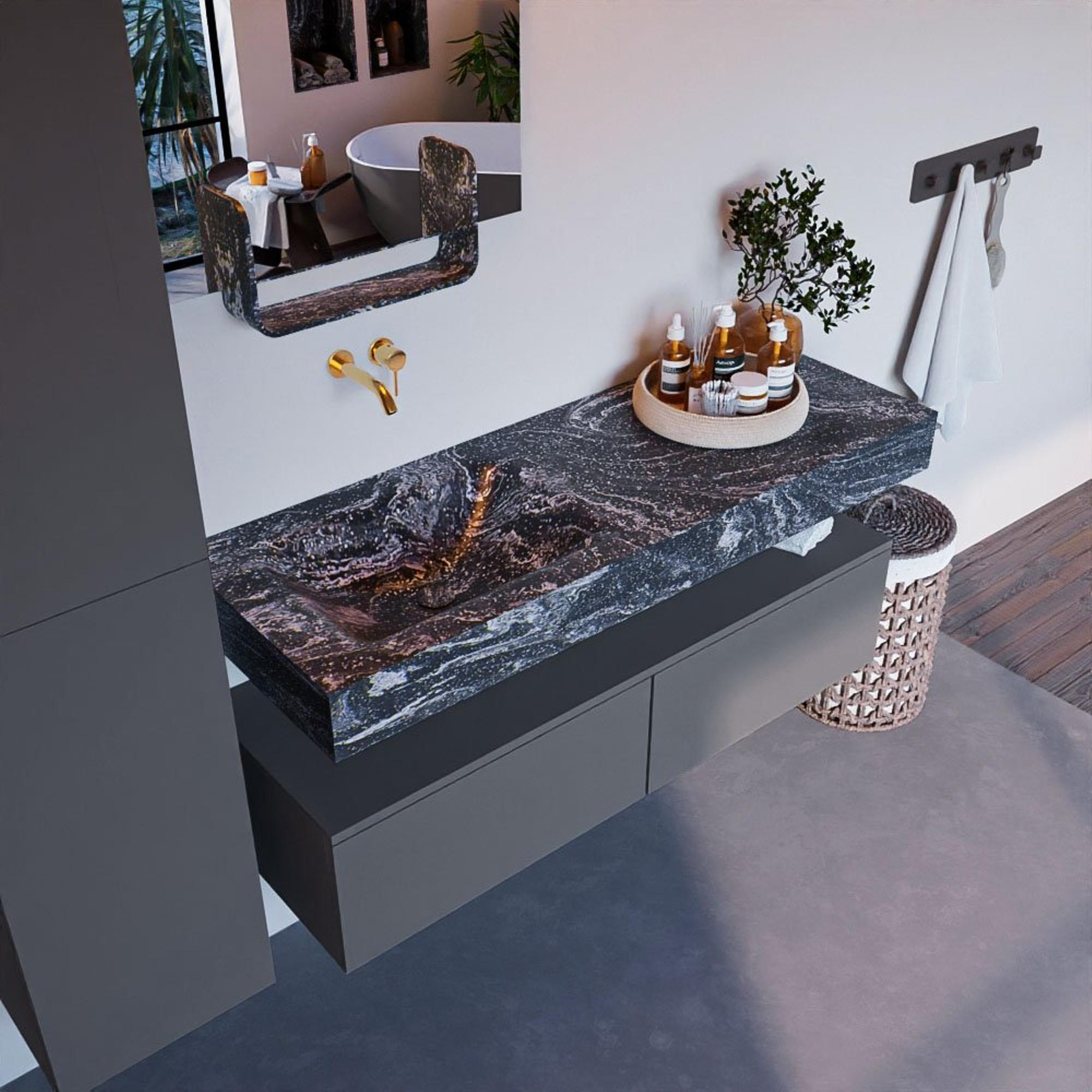 Ontdek de MONDIAZ ALAN - DLUX Badkamermeubelset - een prachtig stuk dat je badkamer transformeert in een oase van luxe en stijl. Met een lengte van 130cm biedt deze badkamermeubelset voldoende opbergruimte met twee lades en een vrijhangende wastafel. De elegante Plata afwerking en de wasbak aan de linkerkant voegen een vleugje moderniteit toe aan je badkamer. Met 0 kraangaten en een Lava kleur, straalt dit meubelstuk klasse en verfijning uit, waardoor het een perfecte aanvulling is voor elke badkamer.