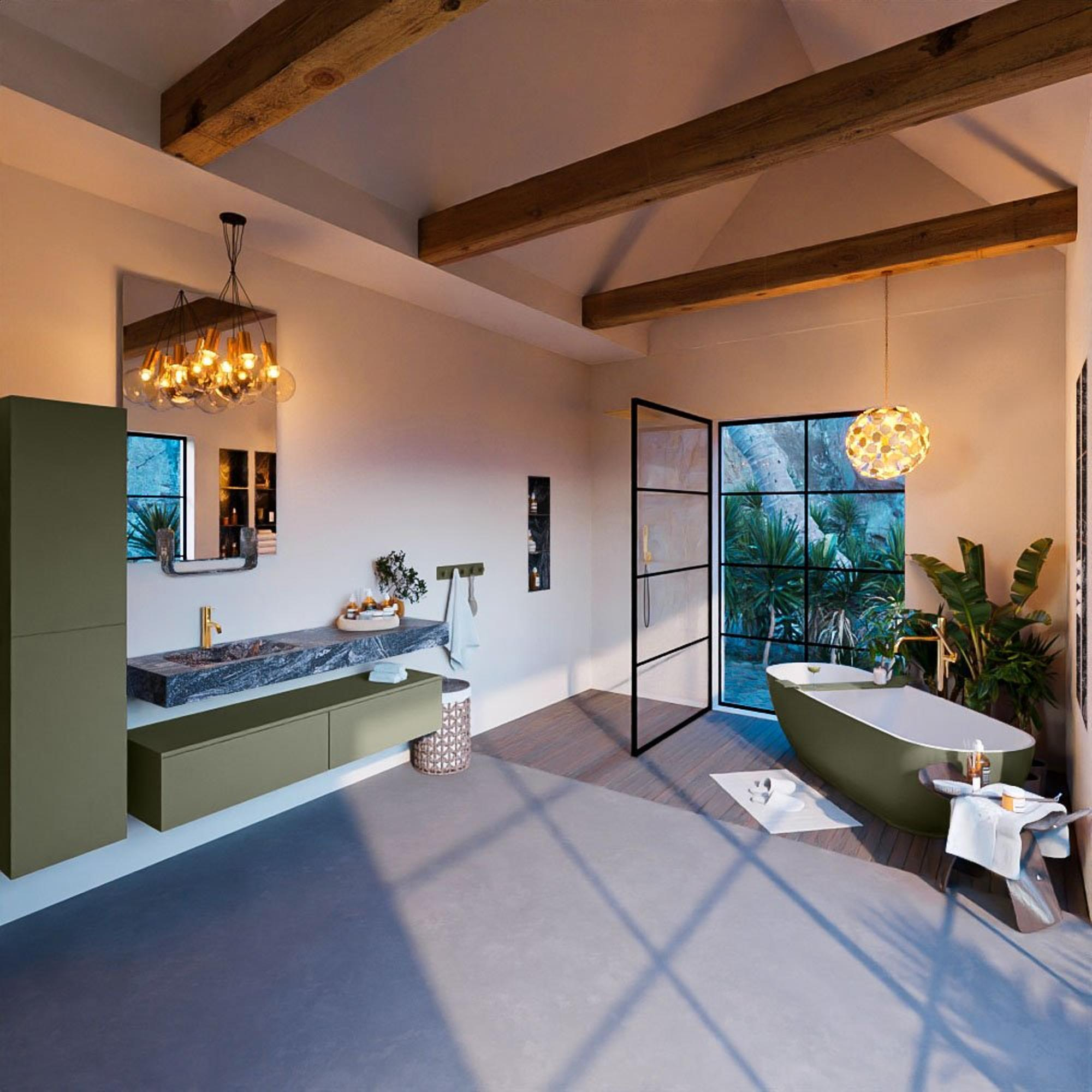 De MONDIAZ ALAN - DLUX Badkamermeubelset is ontworpen met een moderne esthetiek in gedachten. De strakke lijnen, de Army kleur en de vrijhangende wastafel geven dit meubelstuk een eigentijdse uitstraling die perfect past in moderne badkamers. De 2 lades bieden niet alleen opbergruimte, maar dragen ook bij aan de gestroomlijnde look van het geheel.