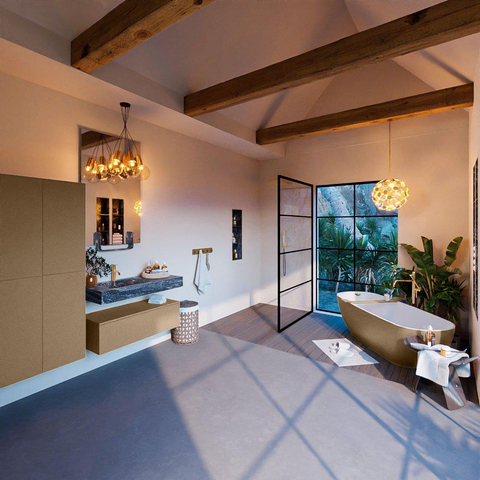 Dit badkamermeubel onderscheidt zich door zijn stijlvolle ontwerp en luxueuze uitstraling. De combinatie van de Oro kleur en de Lava afwerking zorgt voor een tijdloze elegantie in jouw badkamer. De vrijhangende wastafel geeft een gevoel van ruimte en creëert een moderne en minimalistische sfeer.