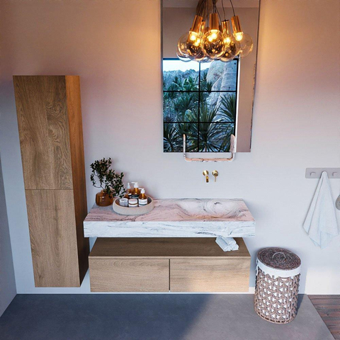 De MONDIAZ ALAN - DLUX Badkamermeubelset is een prachtige toevoeging aan elke badkamer. Met zijn elegante design en hoogwaardige materialen straalt dit meubelstuk luxe en stijl uit. Het 120cm lange onderkast met Washed Oak afwerking en 2 lades biedt voldoende opbergruimte, terwijl de vrijhangende wastafel met wasbak rechts zorgt voor een moderne uitstraling. De 0 kraangaten en Glace afwerking maken dit badkamermeubelset helemaal compleet.