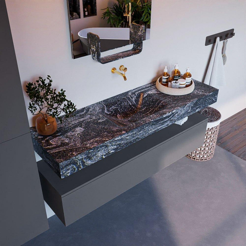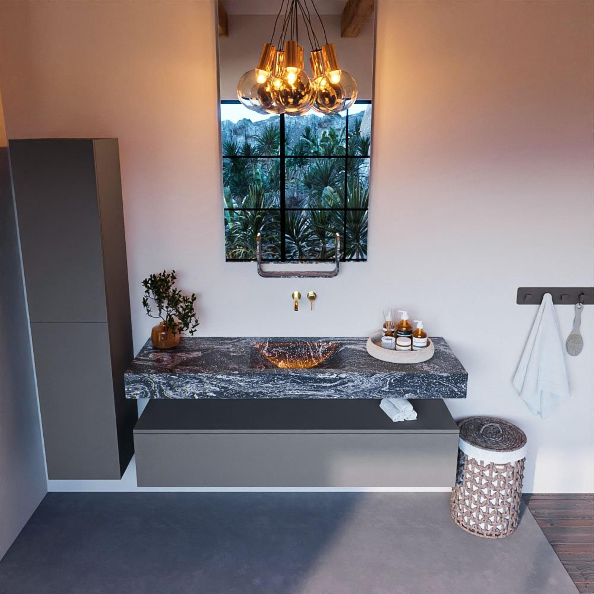 De combinatie van de kleur Lava en de strakke vormgeving van de MONDIAZ ALAN - DLUX badkamermeubelset straalt elegantie uit. Het subtiele ontwerp met de wasbak in het midden creëert een gevoel van luxe en verfijning in de badkamer, waardoor elke ochtendroutine een plezierige ervaring wordt.