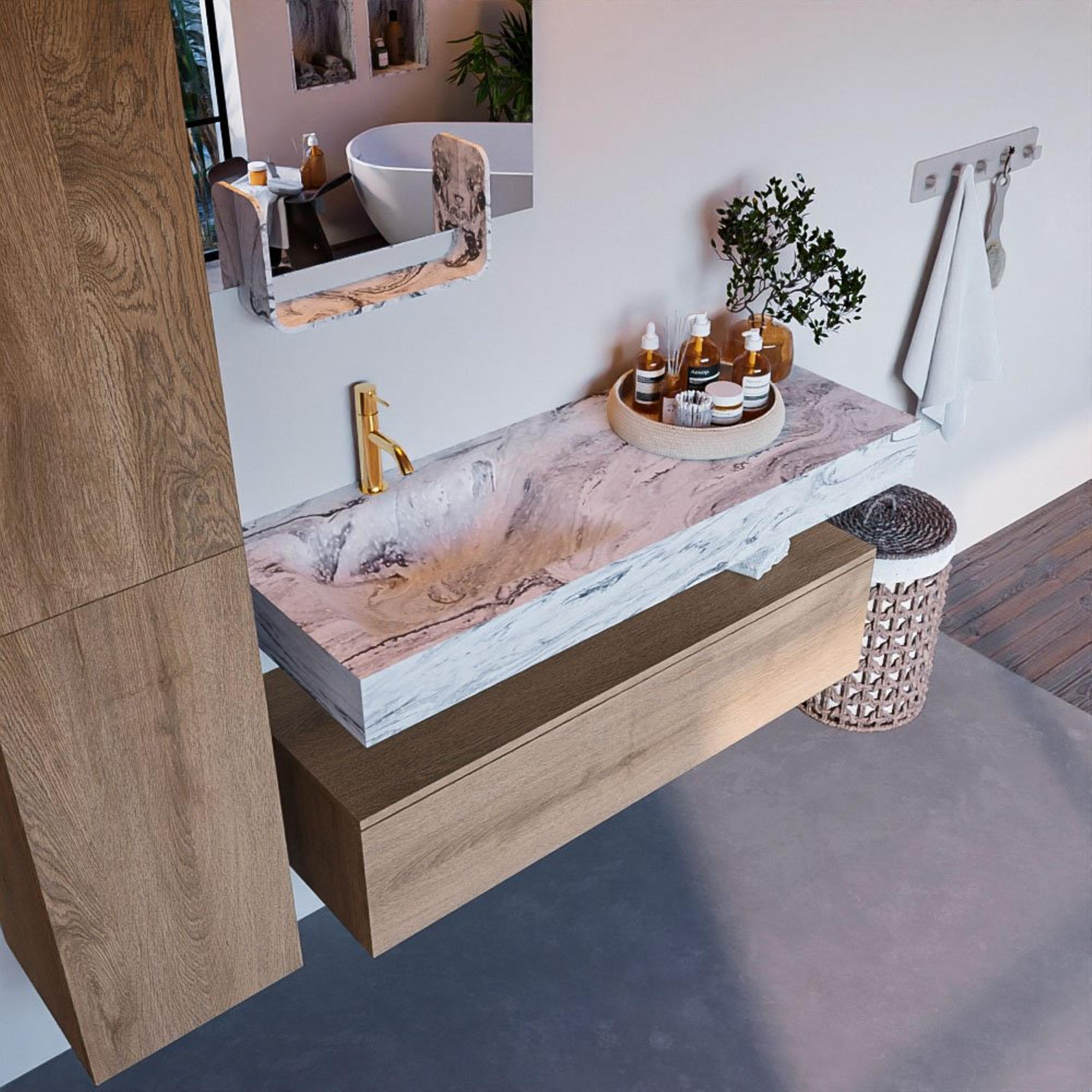 Naast zijn esthetische waarde is de badkamermeubelset ook zeer functioneel. Met een onderkast van 120 cm breed en een lade biedt het voldoende ruimte om toiletartikelen en handdoeken op te bergen. De vrijhangende wastafel met één kraangat maakt het gemakkelijk om de badkamer opgeruimd te houden en zorgt voor een efficiënt gebruik van de ruimte.