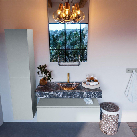 Met een vrijhangende wastafel en strakke lijnen straalt de MONDIAZ ALAN - DLUX badkamermeubelset een moderne uitstraling uit. De Lava afwerking geeft een eigentijdse touch aan het geheel. Dit meubelstuk past perfect in een eigentijdse badkamer en voegt een vleugje luxe toe aan de ruimte.