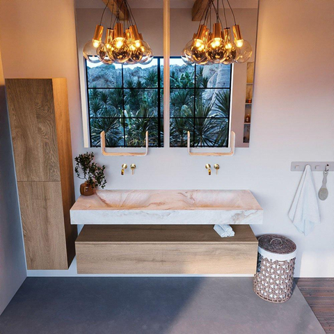 De MONDIAZ ALAN - DLUX Badkamermeubelset is met zijn Washed Oak afwerking en vrijhangende wastafel een stijlvolle keuze voor elke badkamer. De natuurlijke houtnerf en de strakke lijnen van het ontwerp creëren een tijdloze uitstraling die moeiteloos elegantie toevoegt aan de ruimte. Het subtiele kleurenpalet en de minimalistische vormgeving maken dit meubelset een eyecatcher in elke badkamer.