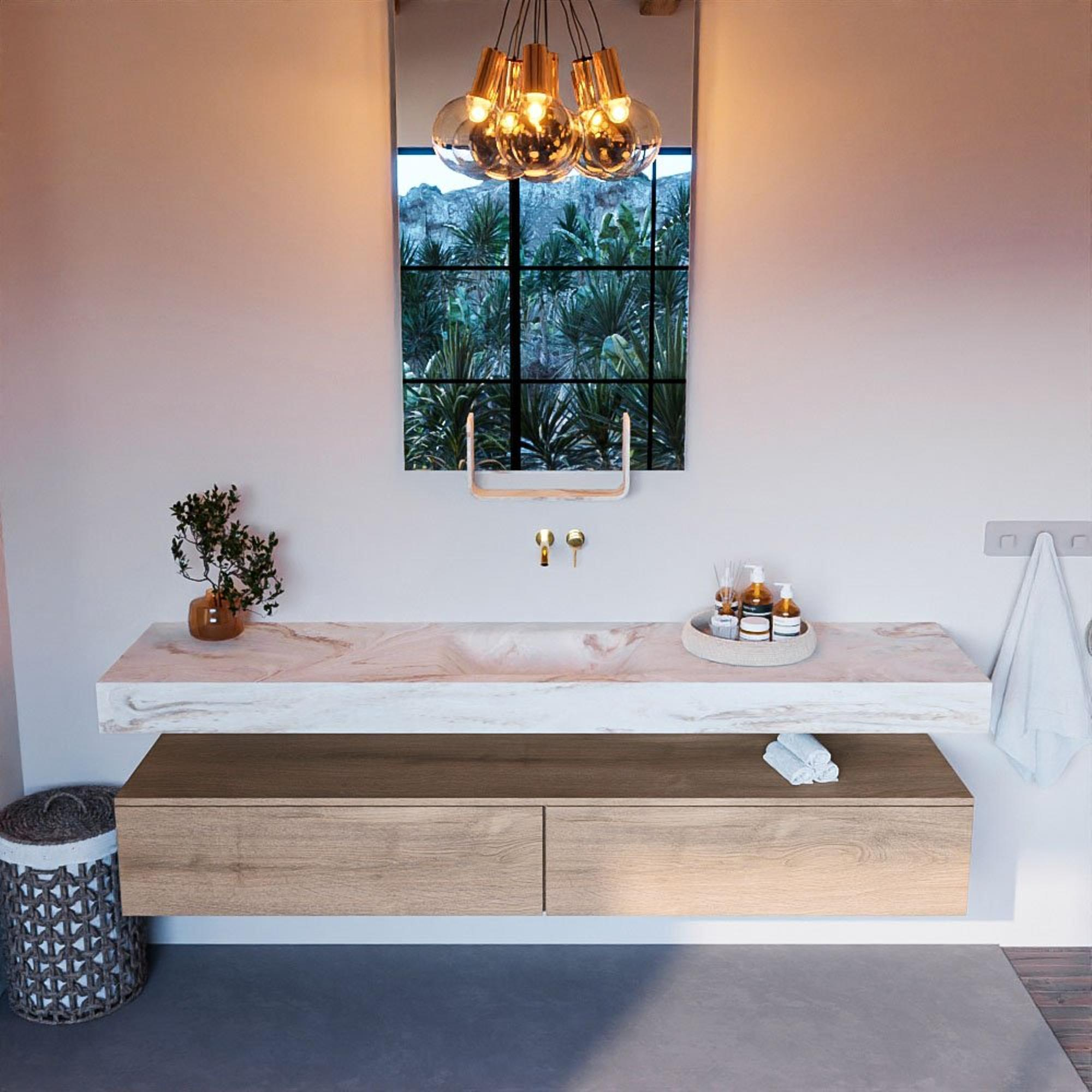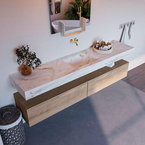 MONDIAZ ALAN - DLUX Badkamermeubelset - 200cm - onderkast - Washed Oak - 2 lades - vrijhangende wastafel - wasbak midden - 0 kraangaten - Frappe