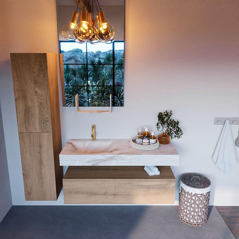 Dit badkamermeubel onderscheidt zich door zijn stijlvolle uitstraling en doordachte ontwerp. De Washed Oak afwerking geeft een warme en natuurlijke uitstraling aan de ruimte, terwijl de vrijhangende wastafel zorgt voor een eigentijdse touch. De 1 lade biedt voldoende opbergruimte voor al uw badkamerspullen, waardoor u uw badkamer netjes en georganiseerd kunt houden zonder in te leveren op design.