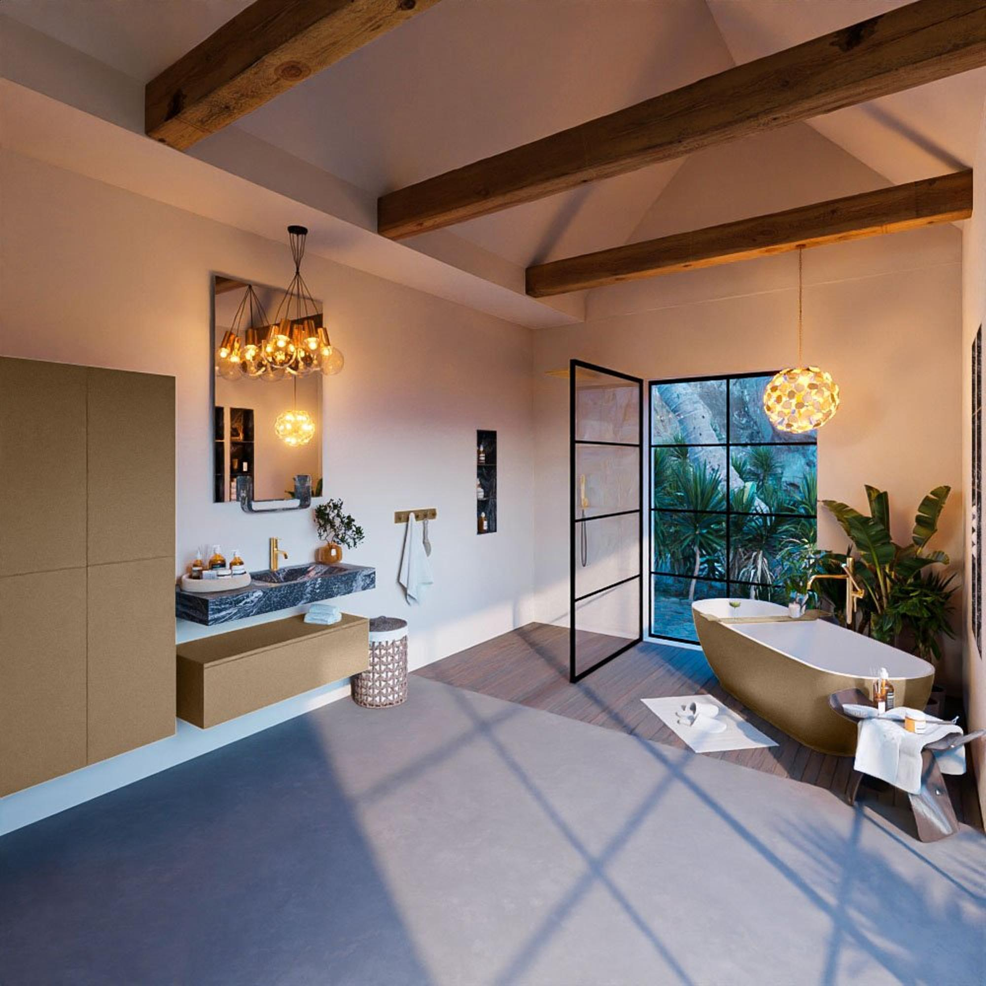 De MONDIAZ ALAN - DLUX badkamermeubelset straalt een tijdloze elegantie uit die perfect past in zowel moderne als klassieke badkamers. Het ontwerp is minimalistisch en chic, waardoor het een verfijnde sfeer creëert. De combinatie van de Oro-kleur met de vrijhangende wastafel en de strakke lijnen zorgt voor een harmonieus geheel dat direct de aandacht trekt.
