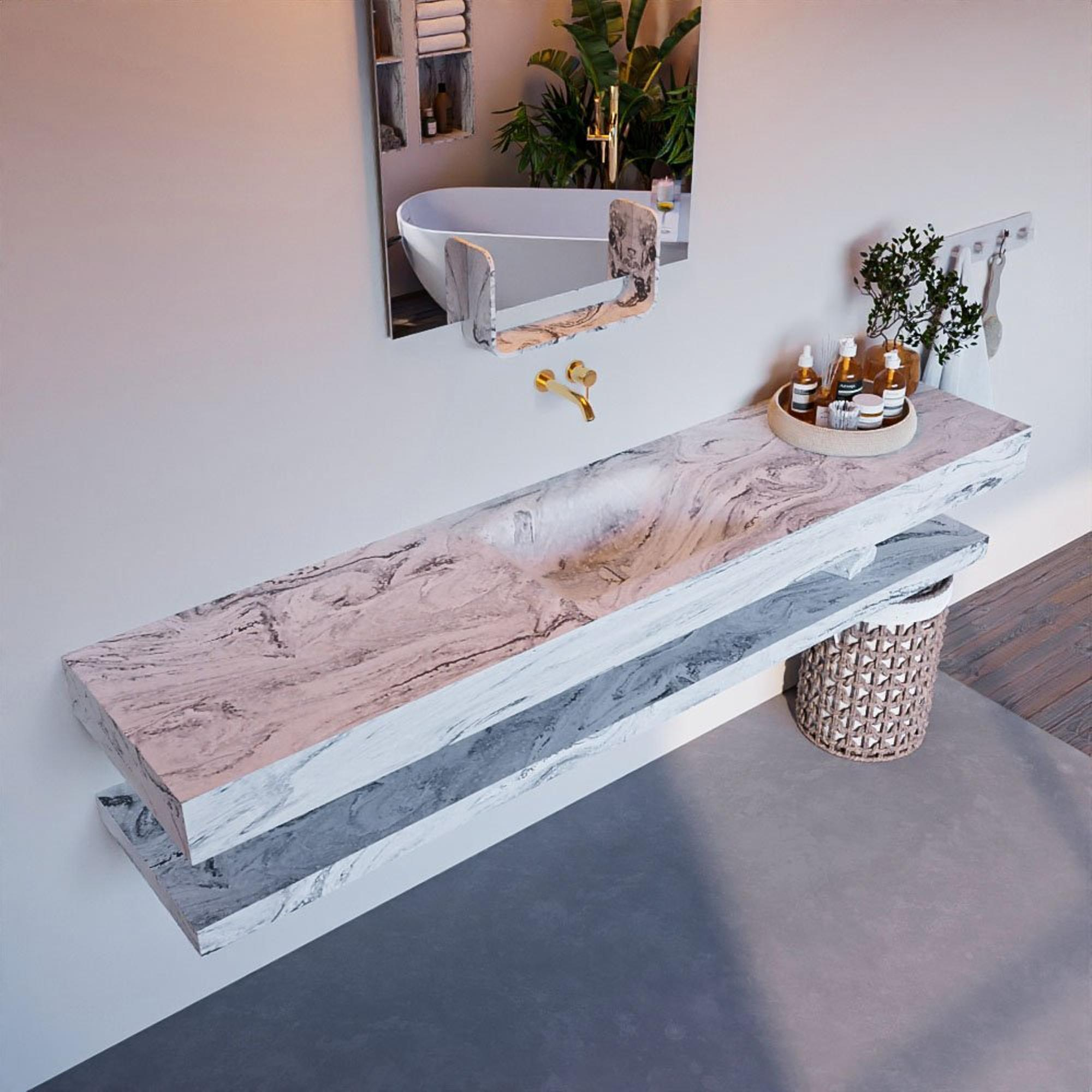 Dit badkamermeubelset van 200cm biedt niet alleen een stijlvolle uitstraling, maar is ook zeer functioneel. Met een vrijhangende wastafel en een wasbak in het midden, maximaliseert het de beschikbare ruimte in de badkamer. De planchet zorgt voor extra opbergruimte voor toiletartikelen en handdoeken, waardoor alles netjes georganiseerd blijft. Dit meubelset combineert design en functionaliteit op een slimme manier.