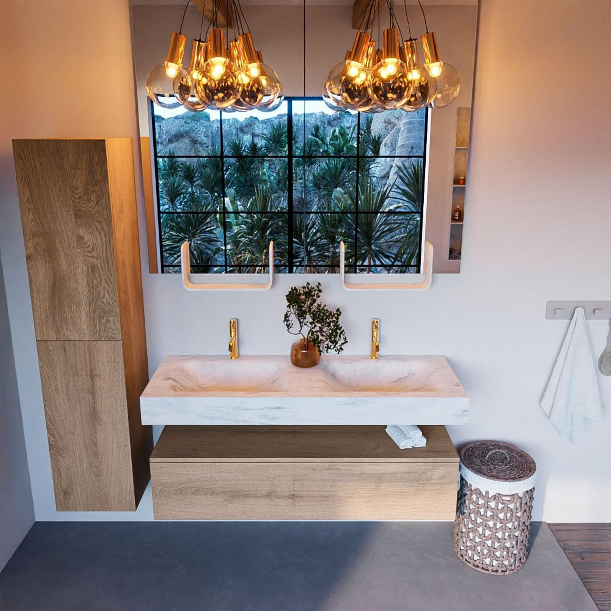 MONDIAZ ALAN - DLUX Badkamermeubelset - 130cm - onderkast - Washed Oak - 1 lade - vrijhangende wastafel - 2 wasbakken - 2 kraangaten - Opalo