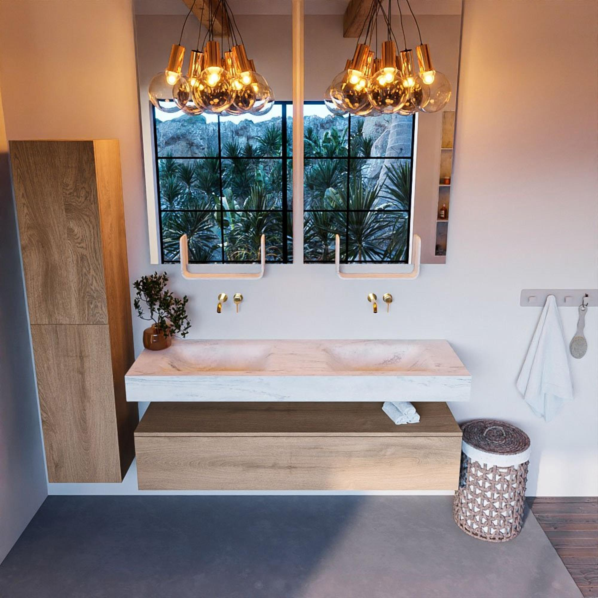 De MONDIAZ ALAN - DLUX Badkamermeubelset straalt luxe uit in elke badkamer. Het Washed Oak design geeft een warme en uitnodigende uitstraling, terwijl de vrijhangende wastafel met 2 wasbakken een gevoel van weelde toevoegt. De 1 lade biedt voldoende opbergruimte voor al je badkamerbenodigdheden, waardoor je badkamer er niet alleen prachtig uitziet, maar ook georganiseerd blijft.
