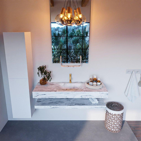 Met een wasbak in het midden en 1 kraangat biedt dit badkamermeubelset ultiem comfort en luxe. De hoogwaardige materialen en de doordachte indeling zorgen voor een praktische en luxueuze ervaring. De ruime afmetingen van 130cm bieden voldoende opbergruimte en maken dit meubelset ideaal voor zowel kleine als grote badkamers. Geniet van een vleugje luxe in je dagelijkse badkamerroutine.
