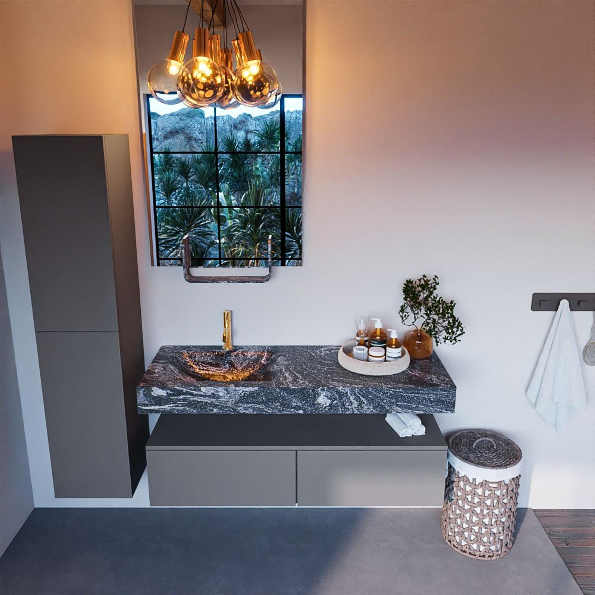 De MONDIAZ ALAN - DLUX Badkamermeubelset straalt een ongeëvenaarde stijl uit. Het design in de kleur Lava geeft een moderne en luxe uitstraling aan je badkamer. De vrijhangende wastafel en de strakke lijnen van de onderkast zorgen voor een minimalistische en eigentijdse look. Deze badkamermeubelset voegt een vleugje elegantie toe aan elke badkamerinrichting.