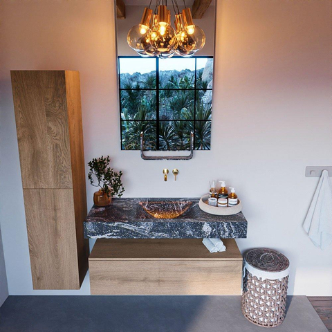 Dit badkamermeubelset combineert functionaliteit met een modern design. Met de wasbak in het midden en de vrijhangende wastafel oogt het geheel strak en eigentijds. De 1 lade biedt voldoende opbergruimte voor al je badkamerspullen, terwijl de Lava kleur een trendy touch toevoegt aan de ruimte.