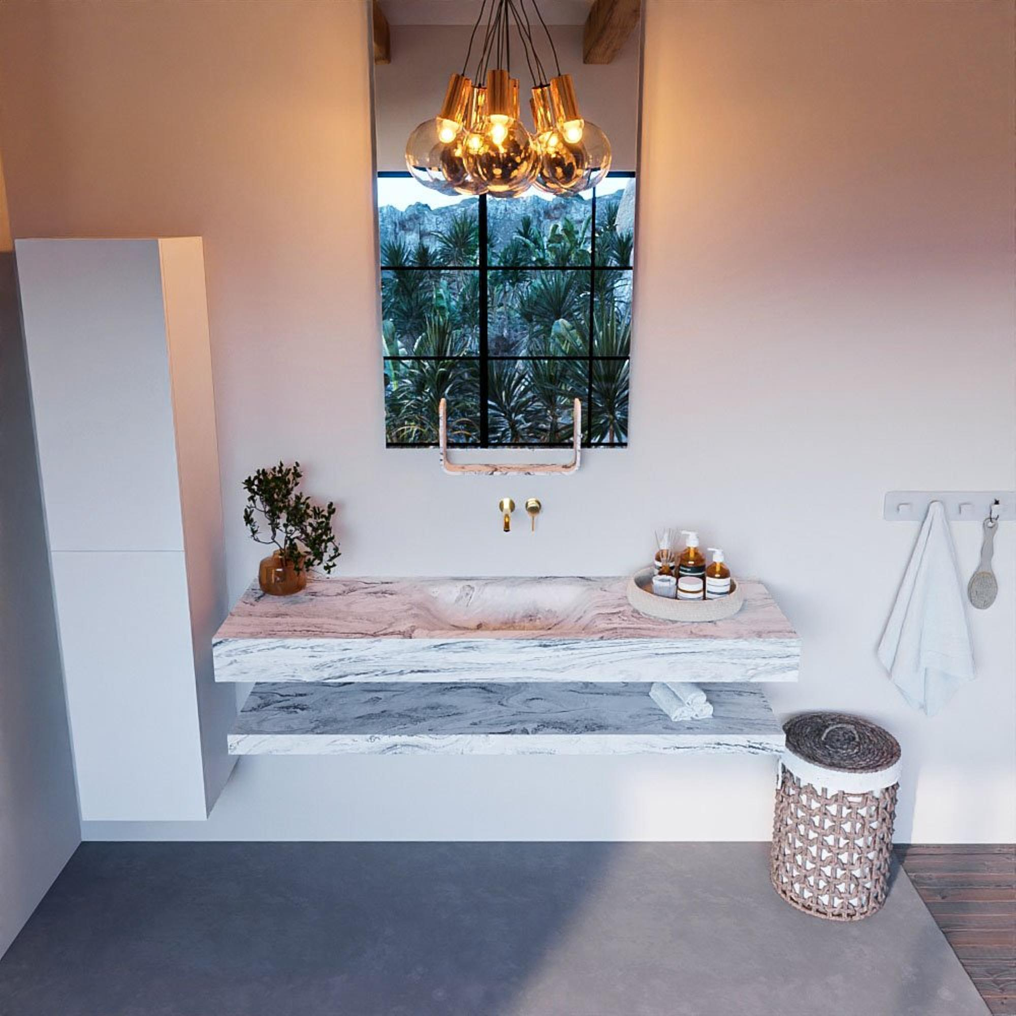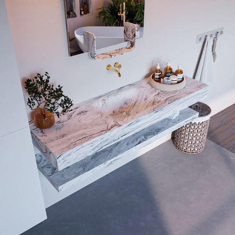 Dit badkamermeubelset is niet alleen mooi, maar ook zeer functioneel. Met een planchet en vrijhangende wastafel wordt de ruimte optimaal benut. De wasbak in het midden zorgt voor een evenwichtige uitstraling. Bovendien heeft het 0 kraangaten, waardoor je zelf de kraan kunt kiezen die het beste bij jouw stijl past.