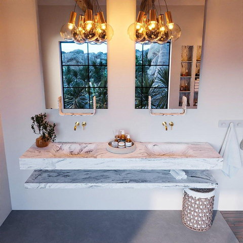 Dit badkamermeubelset is niet alleen mooi, maar ook zeer functioneel. Met een lengte van 200cm biedt het voldoende opbergruimte voor al jouw toiletartikelen en handdoeken. De twee wasbakken maken het mogelijk om tegelijkertijd gebruik te maken van de wastafel, wat handig is tijdens drukke ochtenden. Bovendien zorgen de 0 kraangaten ervoor dat je zelf de kraan kunt kiezen die het beste bij jouw stijl past.