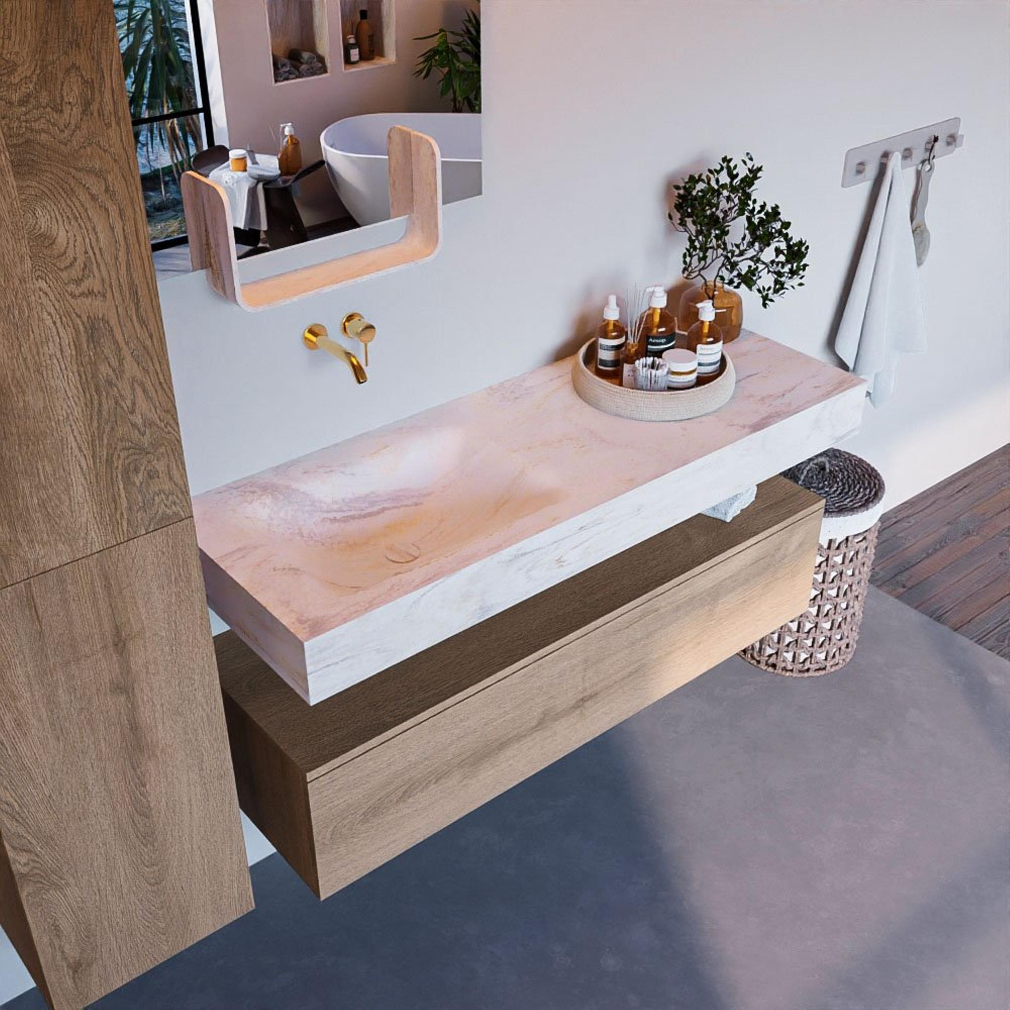 Naast zijn esthetische waarde is dit badkamermeubelset ook zeer functioneel. Met een onderkast van 130cm biedt het voldoende opbergruimte voor al je badkamerspullen. De 1 lade is handig voor het opbergen van kleine items en houdt de badkamer georganiseerd. De wasbak aan de linkerkant zorgt voor een ergonomische indeling en maakt efficiënt gebruik van de ruimte.
