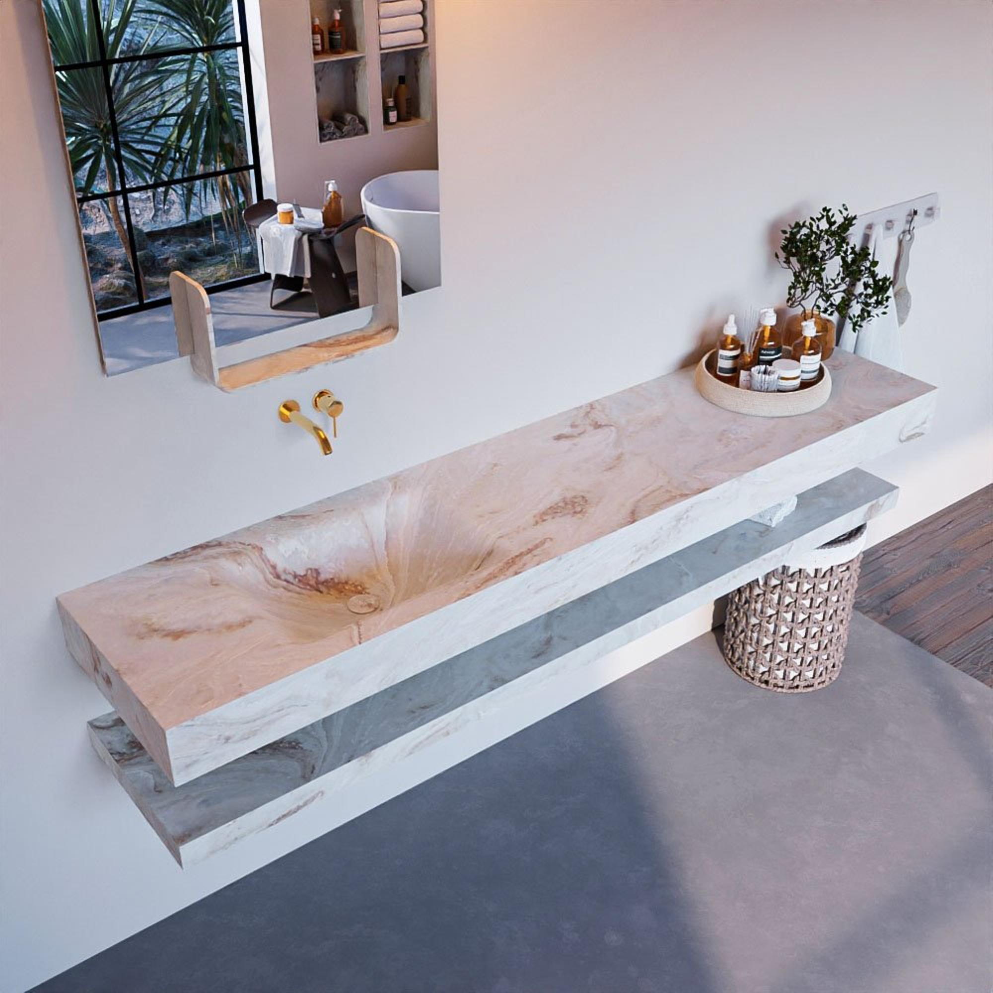 Dit badkamermeubel combineert elegantie met functionaliteit. Met een lengte van 200cm biedt het voldoende opbergruimte voor al je badkamerspullen. De wasbak aan de linkerkant zorgt voor een handige indeling en maakt efficiënt gebruik van de beschikbare ruimte. De planchet biedt extra opbergruimte voor handdoeken en toiletartikelen, waardoor alles netjes georganiseerd blijft.