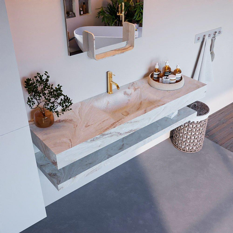 Naast zijn esthetische waarde is dit badkamermeubelset ook zeer functioneel. Met een breedte van 150cm is er voldoende ruimte voor al jouw badkamerspullen. De wasbak in het midden zorgt voor een handige indeling en het kraangat maakt het eenvoudig om een kraan te installeren.