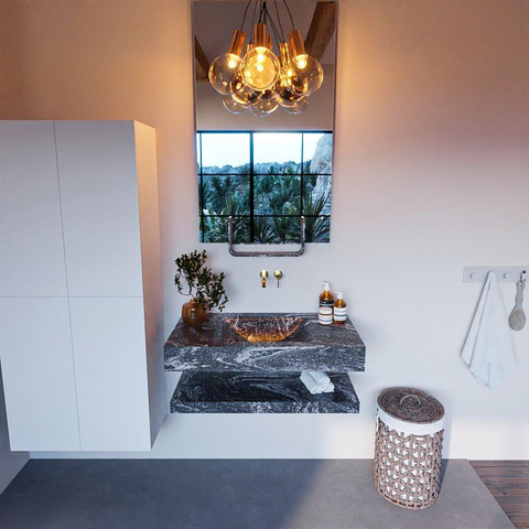 De MONDIAZ ALAN - DLUX Badkamermeubelset straalt stijl en klasse uit. Het Lava design geeft een eigentijdse uitstraling aan je badkamer, terwijl de vrijhangende wastafel en de wasbak in het midden zorgen voor een symmetrisch en evenwichtig ontwerp. De 90cm breedte van het meubel biedt voldoende opbergruimte zonder in te leveren op esthetiek. Dit meubelstuk is perfect voor wie op zoek is naar een combinatie van elegantie en functionaliteit.