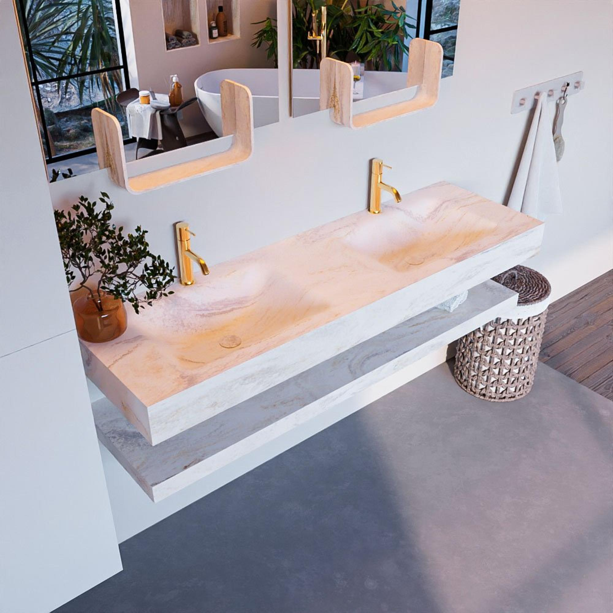 Naast zijn elegante design is de MONDIAZ ALAN - DLUX Badkamermeubelset ook zeer functioneel. Met twee wasbakken en twee kraangaten is dit meubelstuk ideaal voor drukbezochte badkamers. De planchet biedt extra ruimte voor het opbergen van handdoeken en toiletartikelen, waardoor alles binnen handbereik is. De hoogwaardige materialen zorgen voor duurzaamheid en langdurig gebruiksgemak.