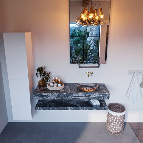 De MONDIAZ ALAN - DLUX badkamermeubelset is ontworpen met oog voor stijl en finesse. Het strakke ontwerp en de lava-kleur geven een eigentijdse uitstraling aan de badkamer. De vrijhangende wastafel zorgt voor een ruimtelijk gevoel en creëert een moderne en minimalistische look. Dit meubelstuk is perfect voor wie op zoek is naar een badkamermeubel dat zowel functioneel als elegant is.