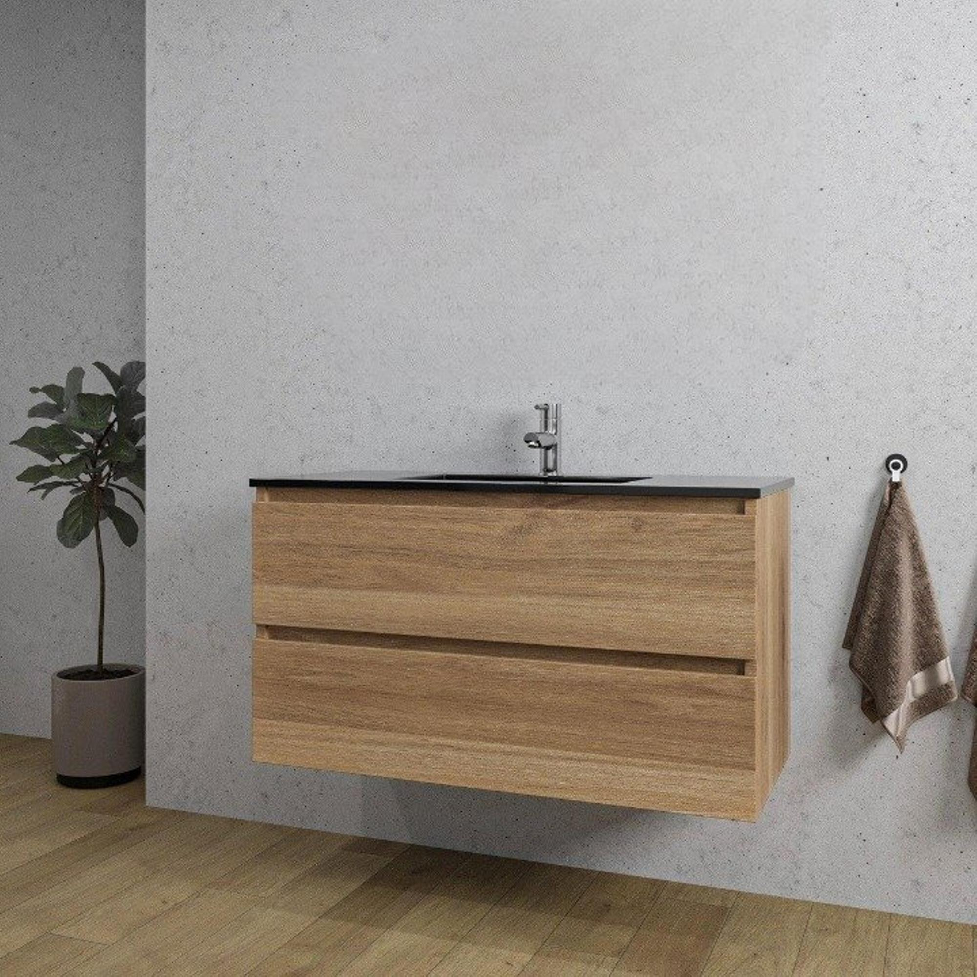Adema Chaci Badkamermeubelset - 100x46x57cm - 1 keramische wasbak zwart - 1 kraangat - 2 lades - eiken